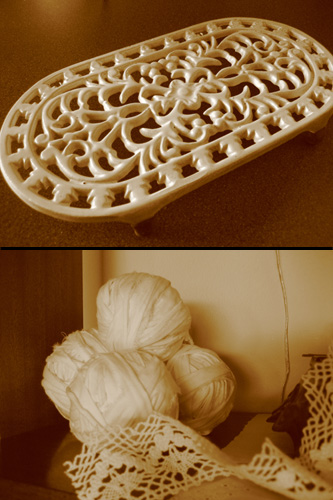 og hér eru sko gömul sænguver sem ég reif niður í ræmur og vatt upp í hnikla sem ég ætla svo nota til að hekla körfur og töskur 🙂 spennandi!