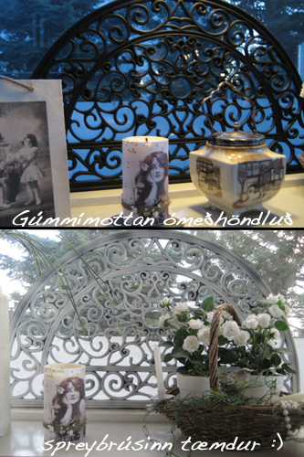 „dýrið“ gekk laust með spreybrúsann í dag og nú var svarta sæta gúmmímottan fórnalambið 🙂 fyrst byrjaði ég á að spreyja gestahliðina þ.e. réttuna og svo þegar ég ætlaði að spreyja bakliðina þá hummmm… fannst mér ílla farið með allt þetta hvíta flotta sprey sem fór á plastið sem var undir! nú ég náði mér í blindramma sem ég var búin að mála svartann og skellti mottunni ofaná’ann og spreyjaði! oohh hvað þetta var gaman 🙂