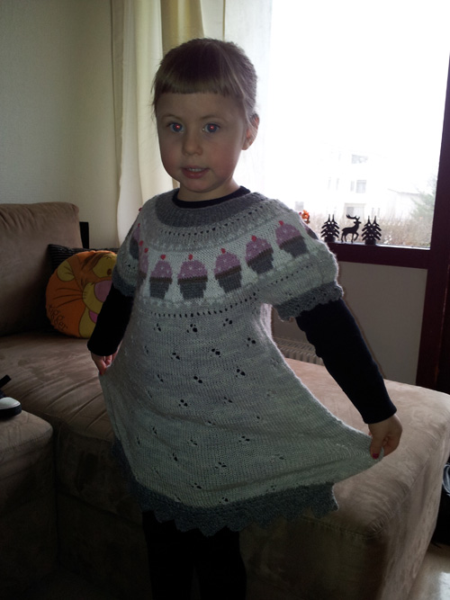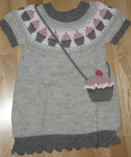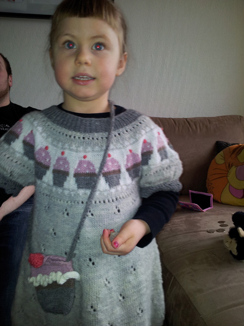 Bara svona í tilefni loka þessarar vinnuviku þá ákvað ég að skella inn myndum af sæta prjónakjólnum sem minnsta prinsessan fékk í afmælisgjöf og litlu veski sem mér fannst tilheyrandi að prjóna svona í stíl 🙂