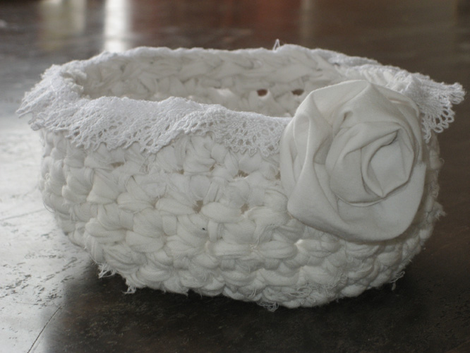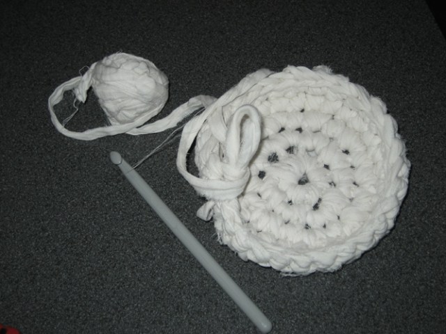 Næst var að prófa að hekla úr lengjunum. Ég notaði heklunál númer 8 og böðlaðist við að hekla mér litla „körfu“…