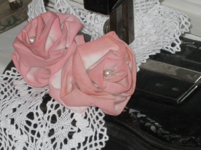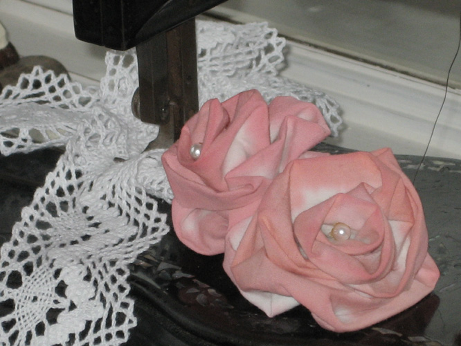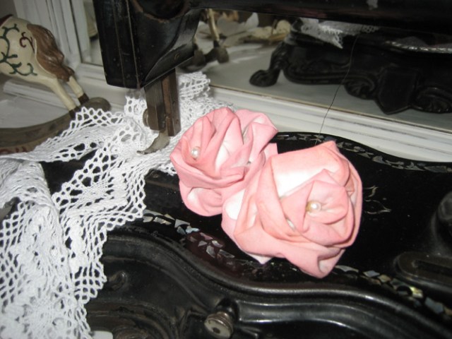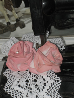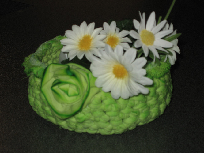 …svo var gert blóm á’ ana og blúnda saumuð á. Græni matarliturinn blandaður og körfunni skellt ofaní…
