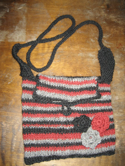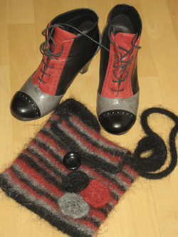 Ég var svo heppin að eiginmaðurinn keypti æðislega skó, sem hann ætlar að gefa mér í afmælisgjöf 🙂 En eins og allir vita eru ýmsir fylgihlutir nauðsynlegir hverri konu s.s. eins og t.d. veski og þá helst í stíl!!! Og enn elti heppnin mig, því ég á léttlopa í alveg sömu litum og eru í skónum, nú svo ég bara dreif mig í að fitja uppá prjónana og prjónaði litla, en hina fínustu tösku, sem ég skellti bara í þvottavélina mína góðu, sem svo sá um að þæfa veskið fyrir mig! Kíktu á…