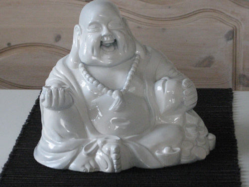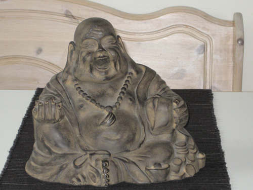 Ég er afskaplega hrifin af öllu sem tilheyrir Búdda og á nokkra fallega t.d. þennan krúttlega, eeeen mér hefur alltaf leiðst liturinn á honum!!! og nú er tími spreybrúsans og því engu hlíft…