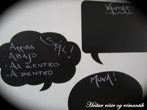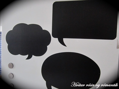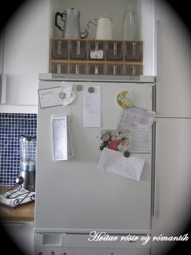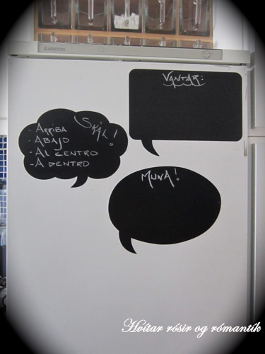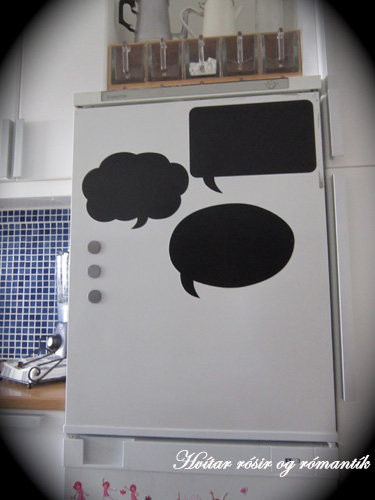 Ísskápurinn á heimilinu er komin af sínu léttasta skeiði og er orðinn dulítið sjoppulegur, þ.e hurðin á honum. Nú og svo safnast „óvart“ á hann ýmislegt sem maður ætlar að muna eftir… Einn daginn þegar ég var að vafra um Pinterest sá ég lausnina, það var að líma „töflu“ límmiða á hann. mér finnst nú límmiðarnir á Pinterest flottari, en ég fann þessa sem ég setti á skápinn hjá Söstrene Grene http://www.facebook.com/Grenes