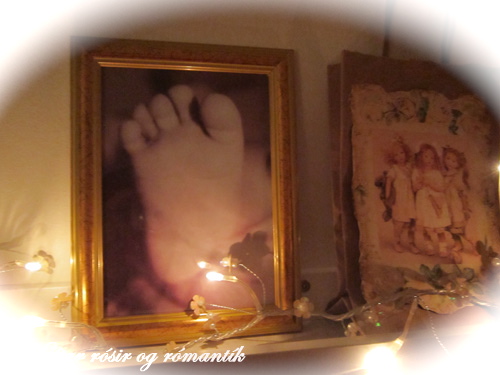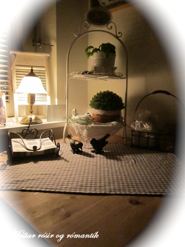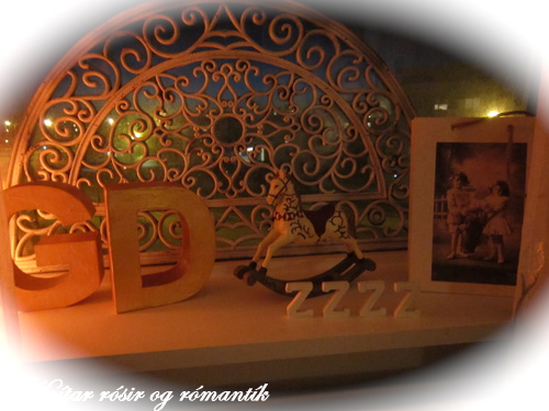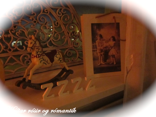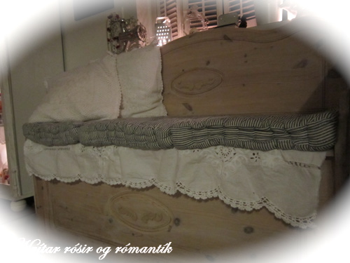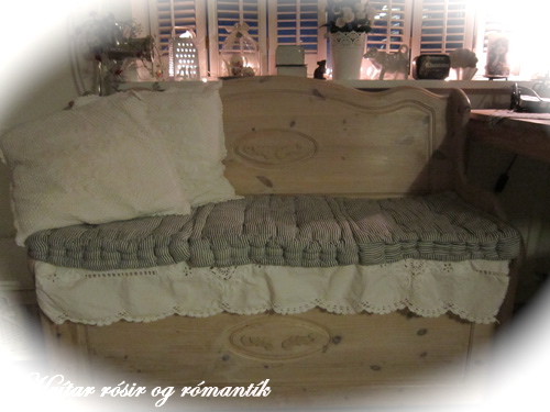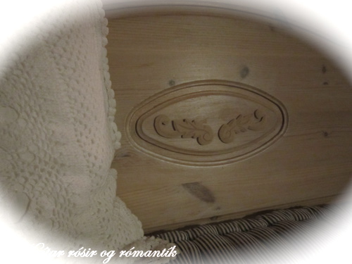 …en nýjasta breytingin er þetta skraut sem ég keypti í Föndru um daginn og hvíttaði það og límdi síðan á bekkinn. Dubbar bara heilmikið upp á´ann 🙂