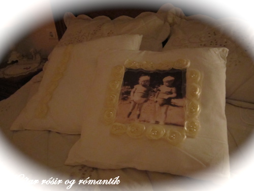 Frmraunin að púðagerð. Ég tók þessa „gömlu“ mynd sem ég á af okkur hjónunum, þar sem við erum örugglega um ca 2 ára gömul. krúttlegt! prentaði hana út á „efnispappírinn“ og þetta kemur bara nokkuð vel út.