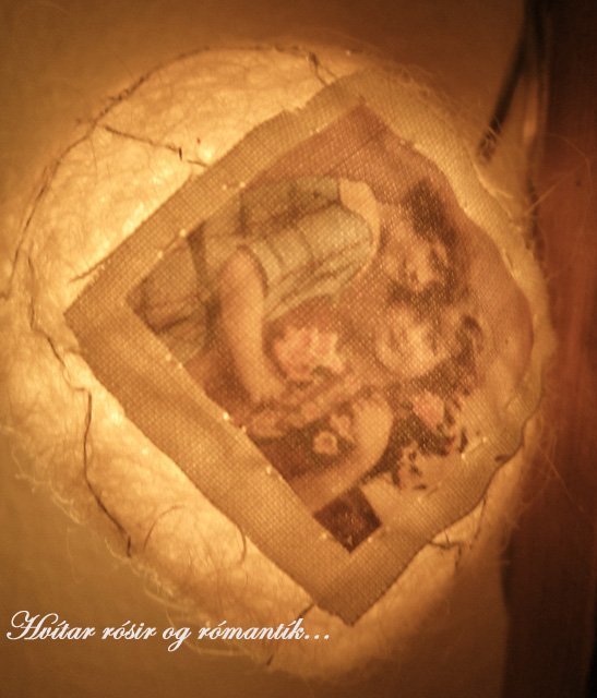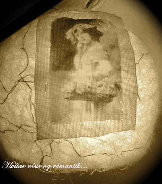 Þessi er þæfð og mótuð með bjöllulagi. Síðan saumaði ég á hana litlar myndir sem ég hafði prentað á „straupappír“ og strauað á efni…