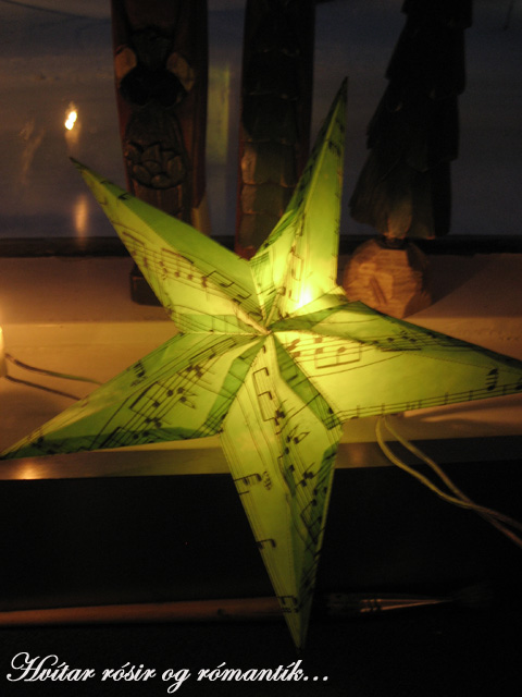 stjarnan er gerð á pappír sem ég hafði prentað á nótur, svo málaði ég pappírinn með matarlit og bar síðan á hann matarolíu! þá kemur þessi skemmtilega áferð á pappírinn og…