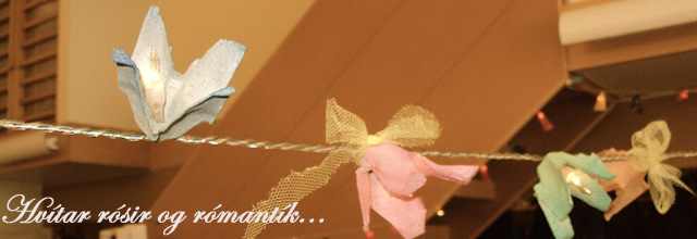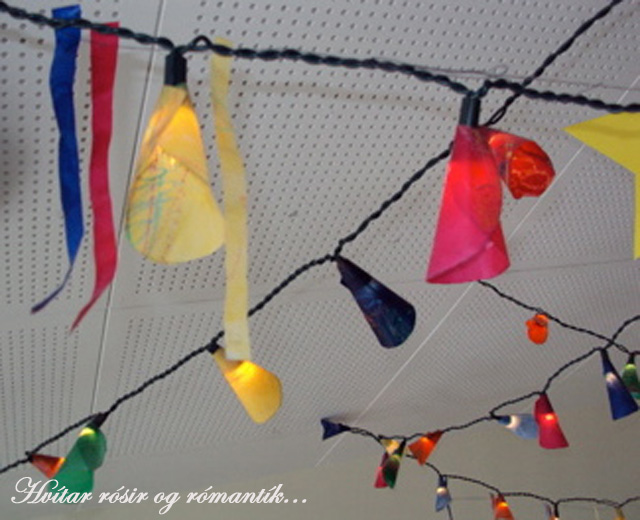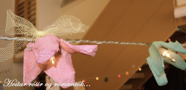 Þessi sem er úr eggjabökkum og sómar sér vel hvort sem er í leikskólanum eða heima. Hún kemur ótrúlega skemmtilega út.. „blómunum“ er dýft ofan í vatn með matarlit í eða bleki og svo þurrkað. skreytt með tjulli…