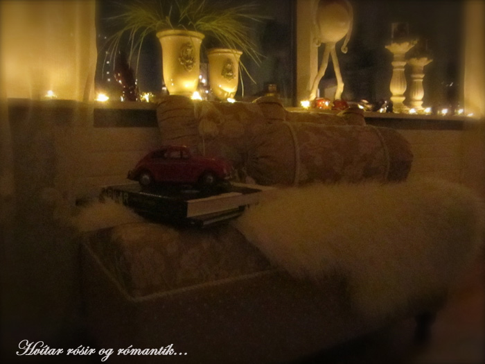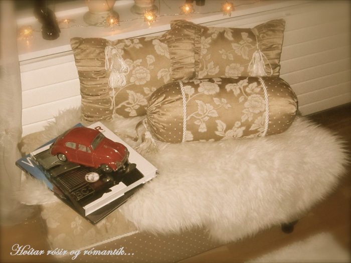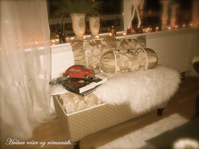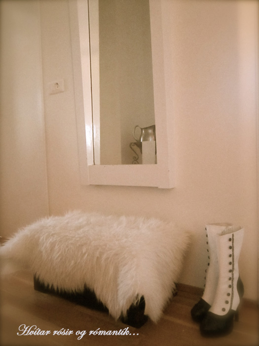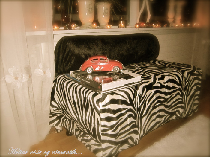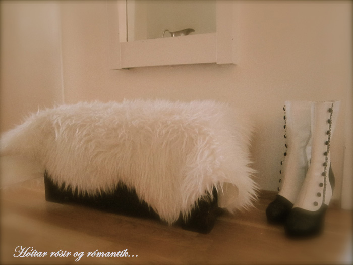 það kom smá breytingarlöngun yfir mig en ég fékk þá flugu í höfuðið, að setja nýtt lúkk á bekk sem ég er með inni í stofunni. Ég fór út í næstu vefnaðarvöruverslun hér í Hafnarfirði og fann þetta bara huggulega „skinn“ eða þannig…