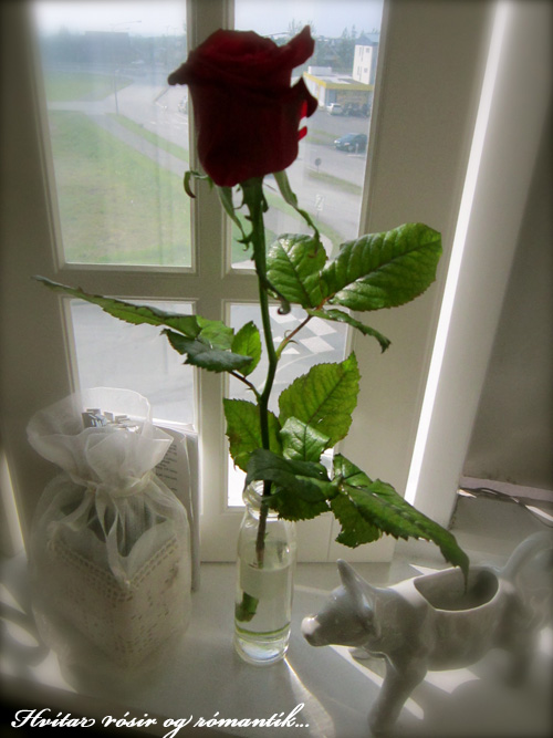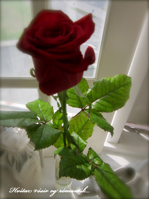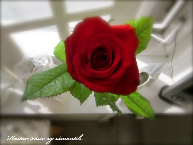 Þar sem það er föstudagur er tilvalið að svífa inn í helgina með myndum af fallegri rauðri rós sem mér var færð í dag af ungri blómarós… njóttu með mér