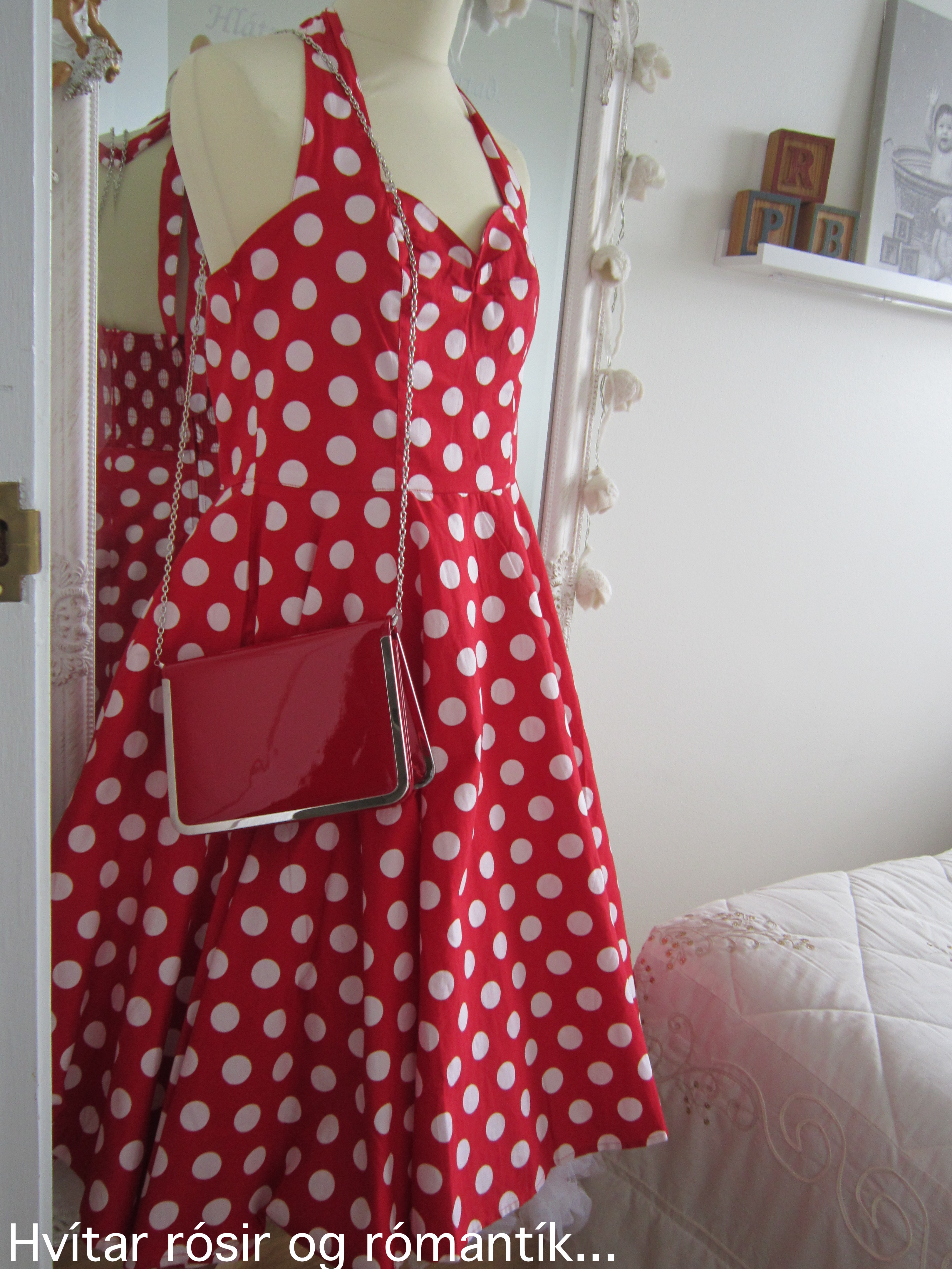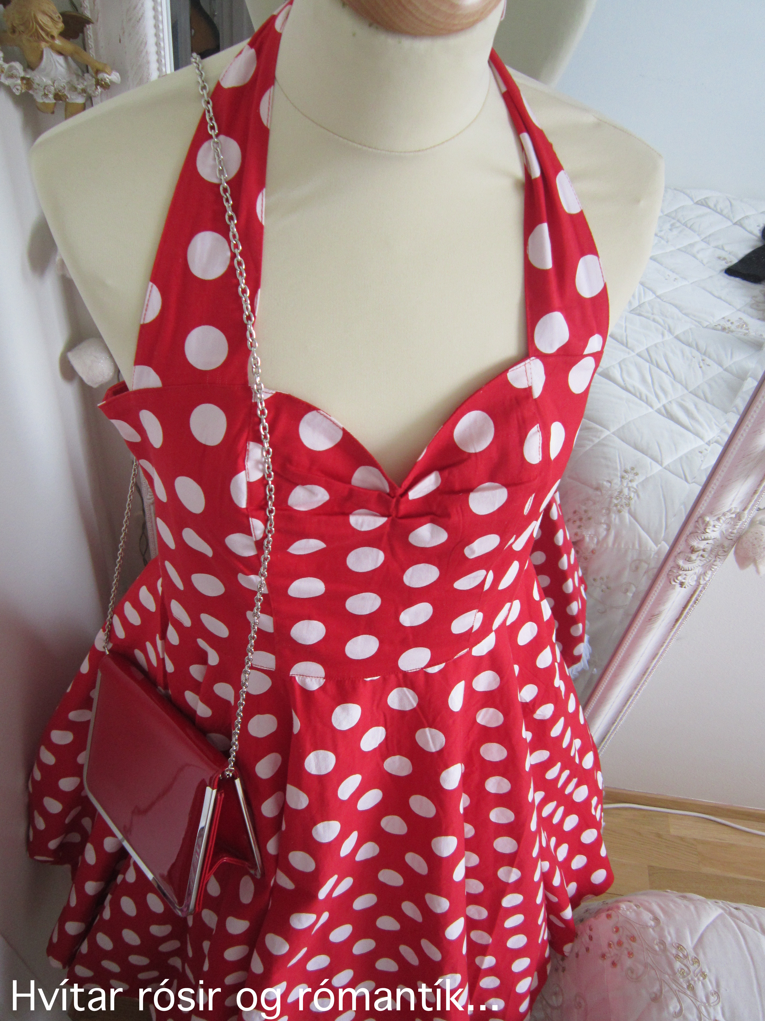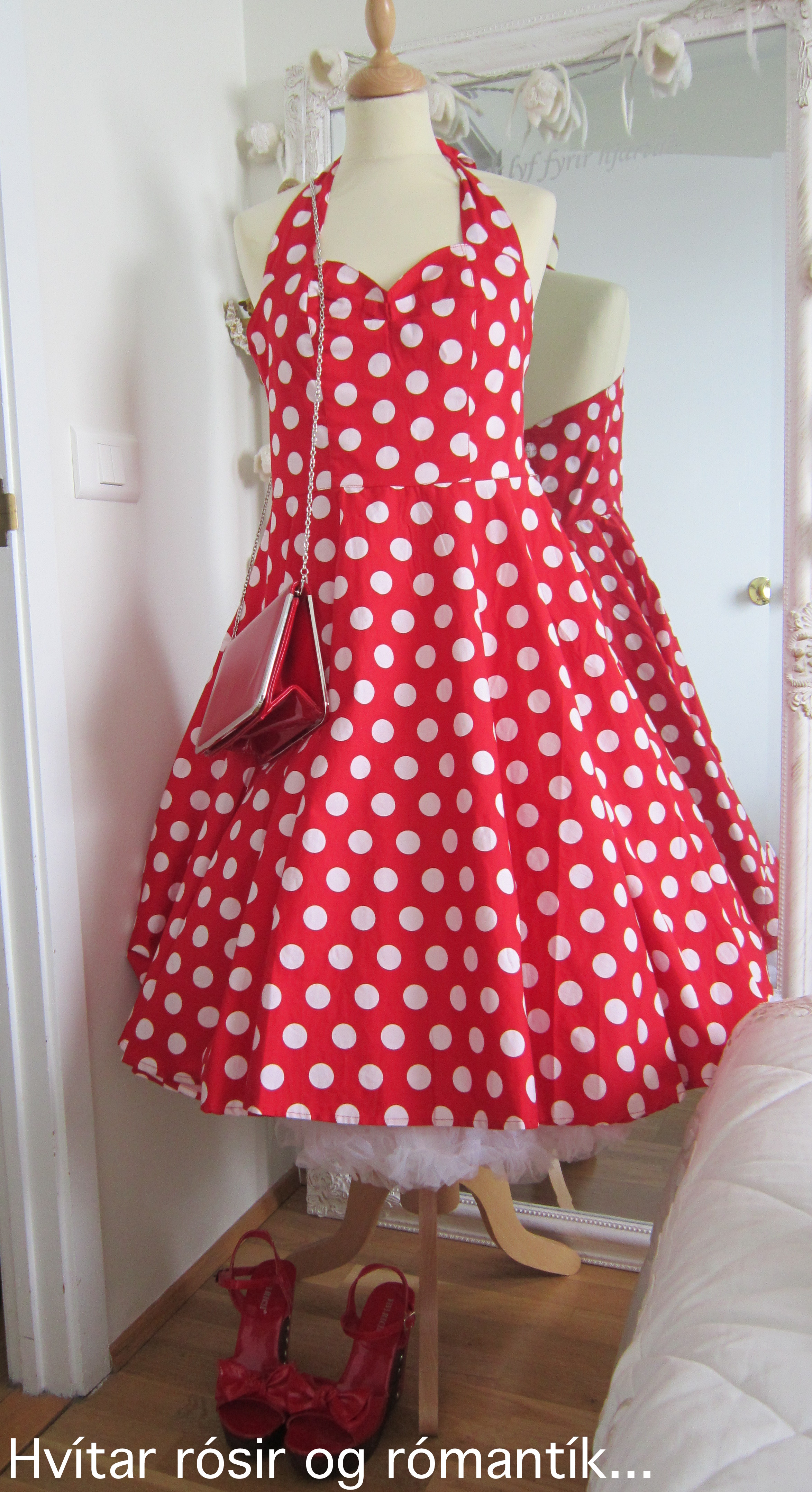 jæja hér kemur annað sýnishorn úr kjólasafni frúarinnar… þessi er nýlegur, keyptur fyrir afmæli eiginmannsins 😉 fallega rauður með hvítum doppum og „gamaldags“, undirpilsið gerir hann sparilegan, en hann er líka smart án þess! kíktu bara á…