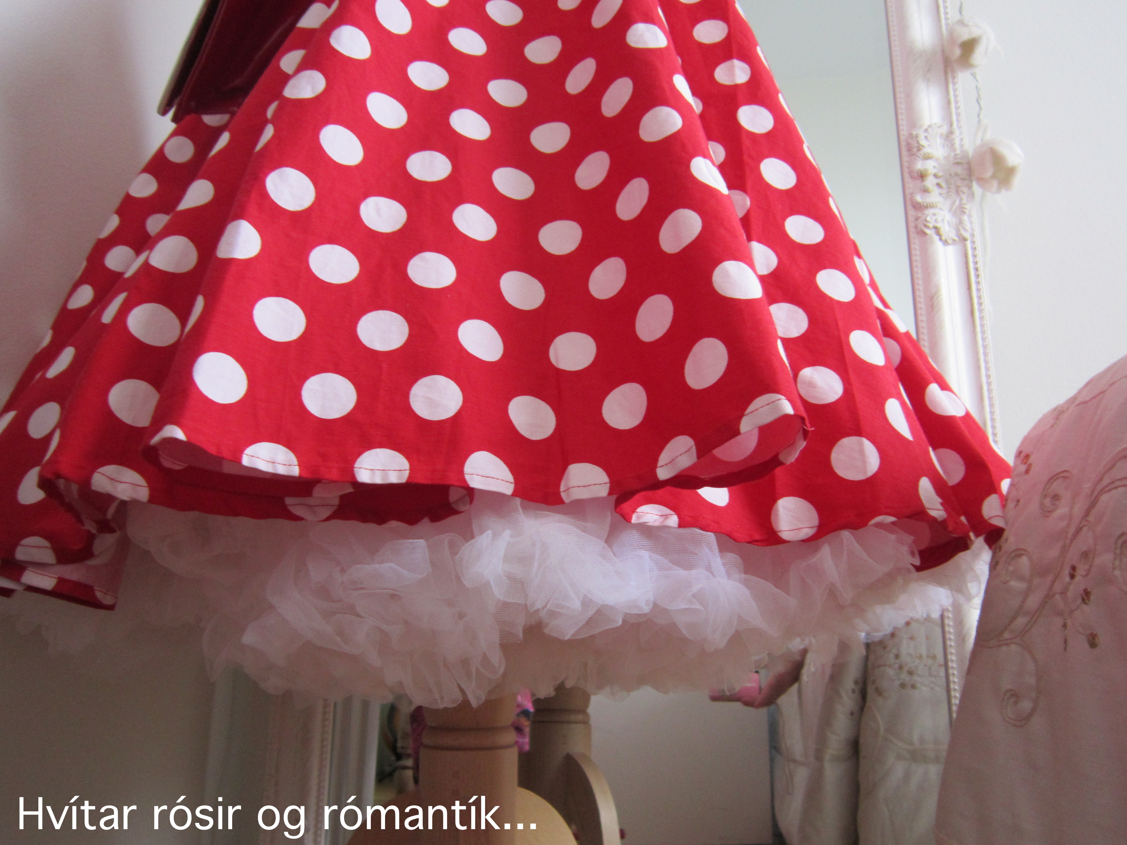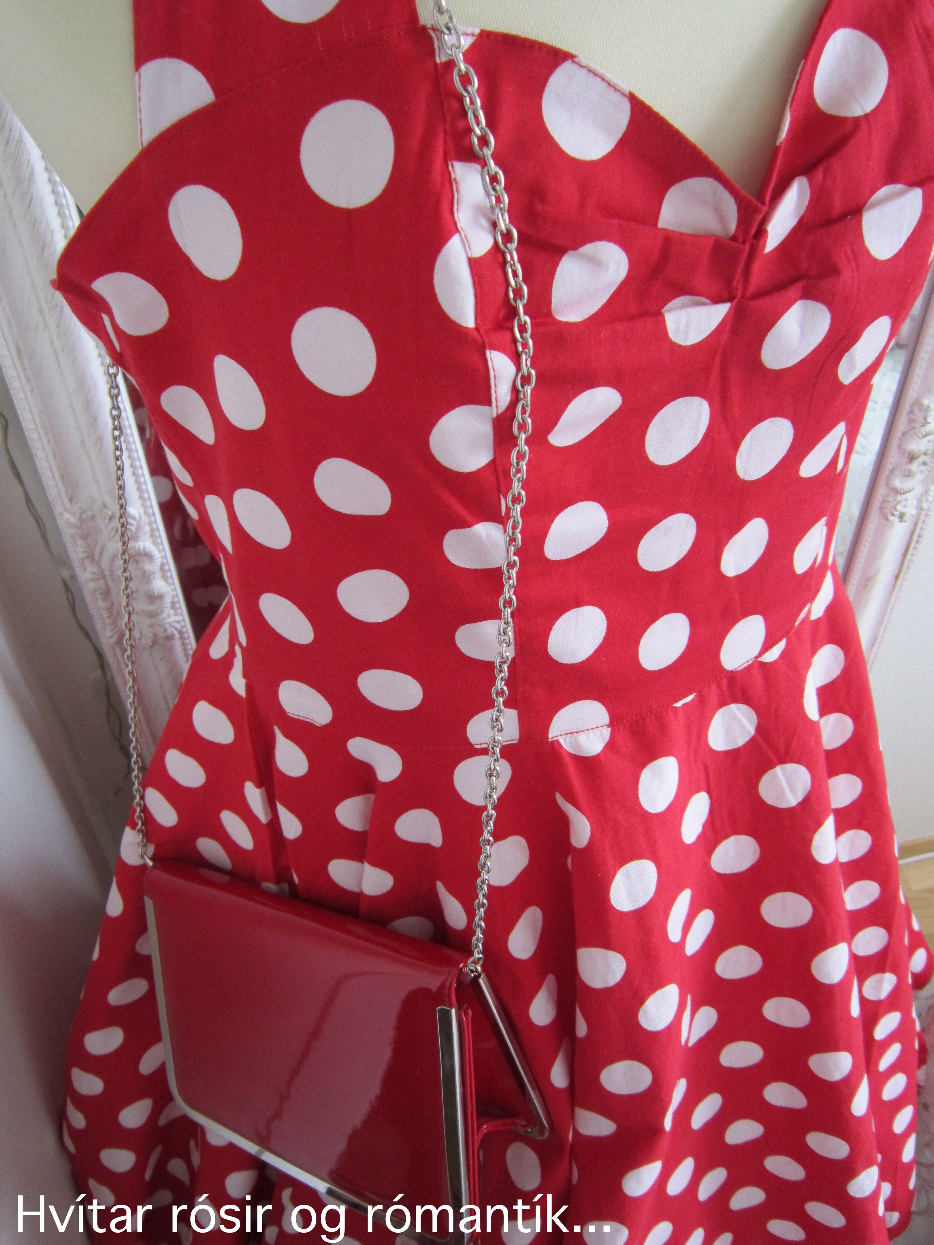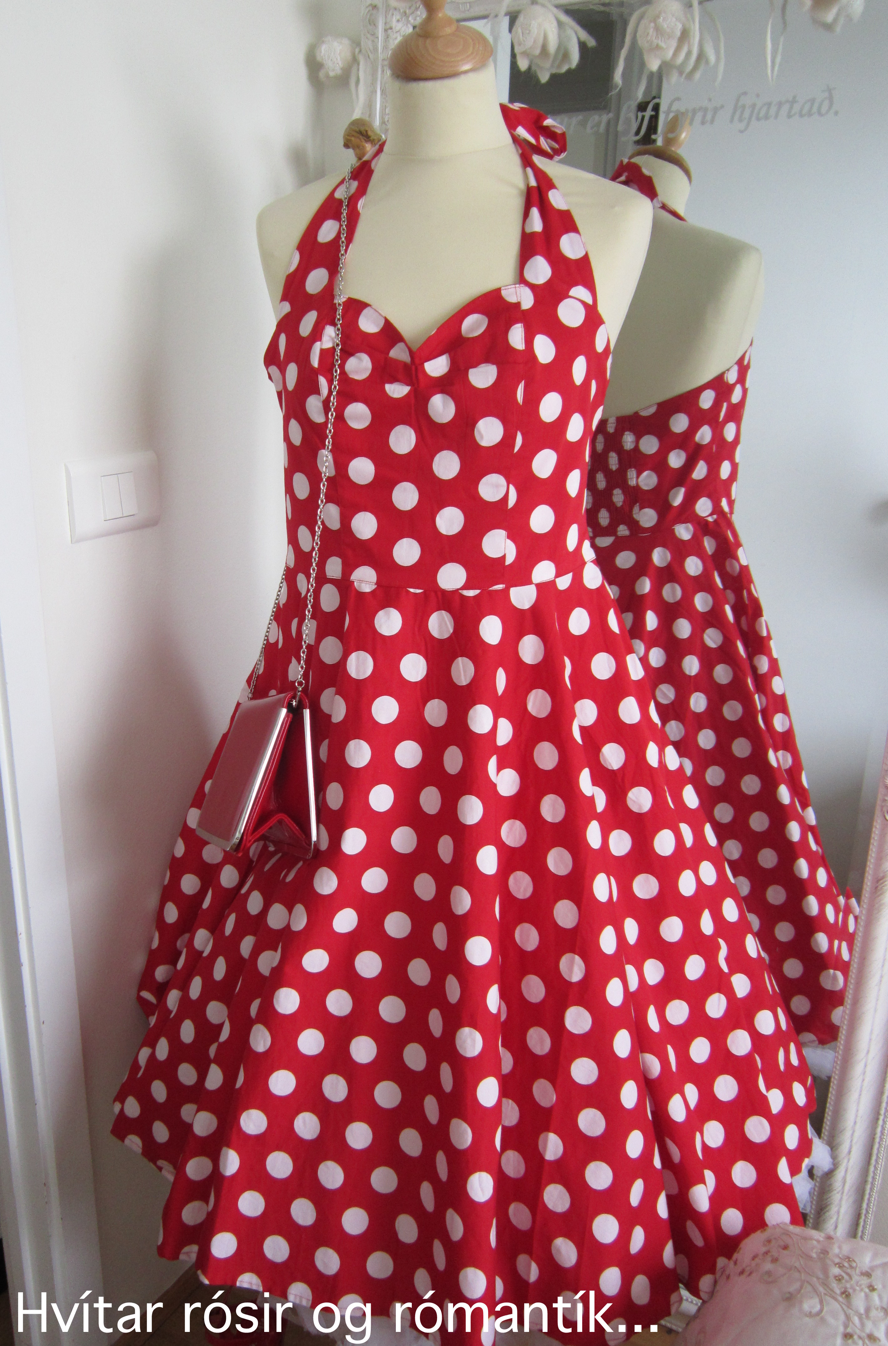 jæja hér kemur annað sýnishorn úr kjólasafni frúarinnar… þessi er nýlegur, keyptur fyrir afmæli eiginmannsins 😉 fallega rauður með hvítum doppum og „gamaldags“, undirpilsið gerir hann sparilegan, en hann er líka smart án þess! kíktu bara á…