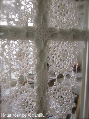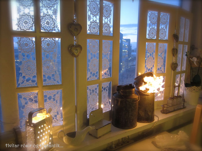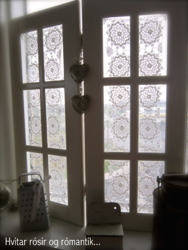 Þá er komið að því að sýna eldhúsgluggann minn, og nú eru blúndur mættar á staðinn.  Ég fékk blúndudúk í „þeim góða“ og ákvað þegar ég kom heim með hann, að klippa hann niður og nota í gluggahlerana mína 😉