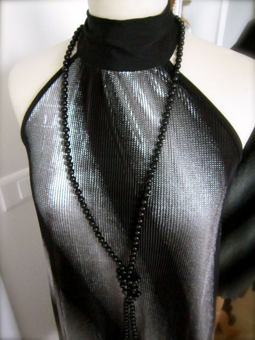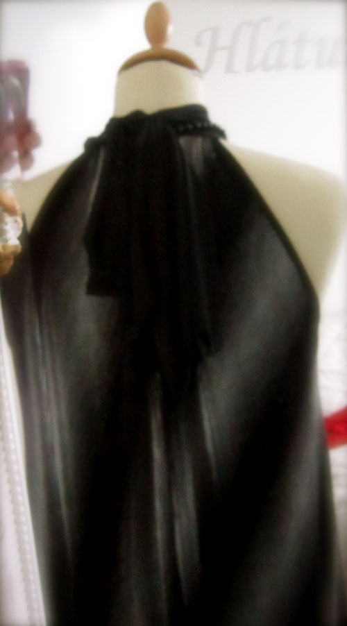 svartur kraginn er tekinn saman og bundinn að aftan…
