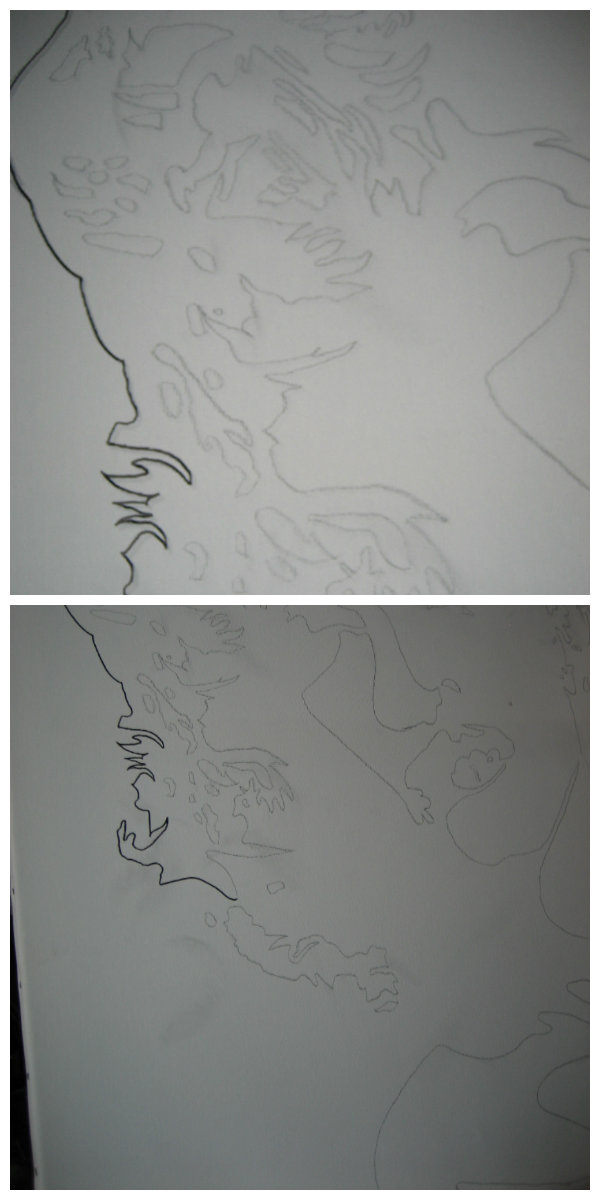 Búin að rissa upp dömuna og það með röngum blýanti þ.e. hann var of mjúkur og kámaðist auðveldlega út á strigann…