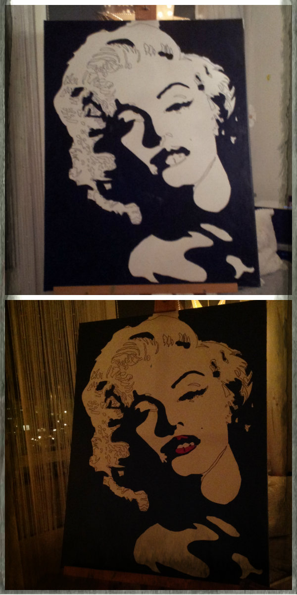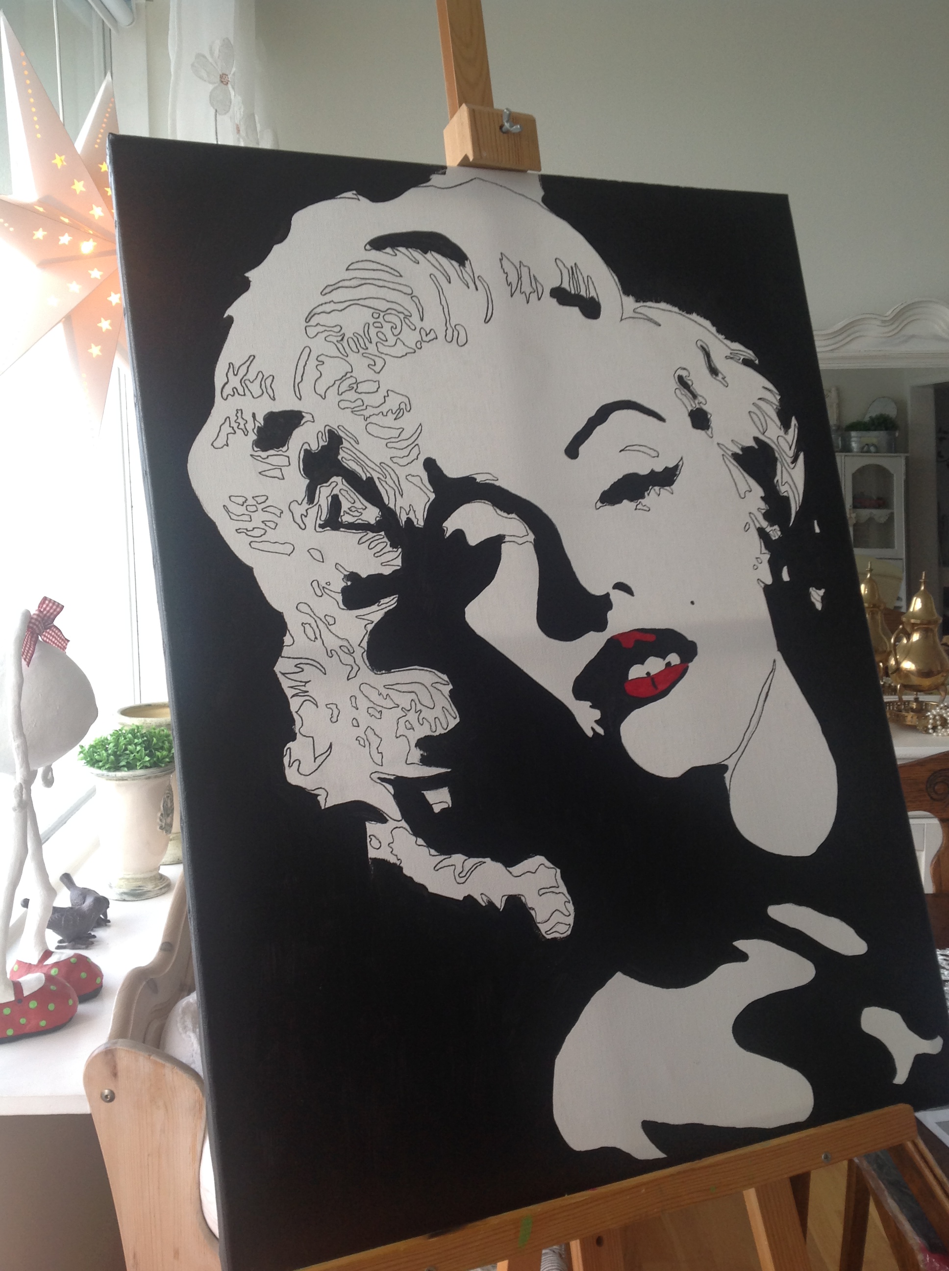 Eldri sonur minn og tengdadóttir voru að fá sér fallegan kertaaren um daginn. Ég þurfti að sjálfsögðu að skipta mér af málinu og vildi vita hvað þau ætluðu að hafa fyrir ofan hann. Þau voru nú ekkert farin að spá í það þessar elskur, nú svo ég tróð mér framm og spurðu hvort ég mætti ekki mála mynd þar sem ég ætti til ómálaðann striga 😉 Þau greyin þorðu náttúrulega ekkert að mótmæla, enda ég ábyggileg frekar ýtin… Það endaði semsagt þannig að ég var svo heppin að fá að mála mynd af mínu uppáhalds, Marilyn Monroe fyrir þau 🙂