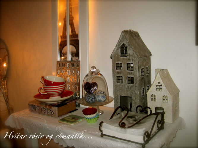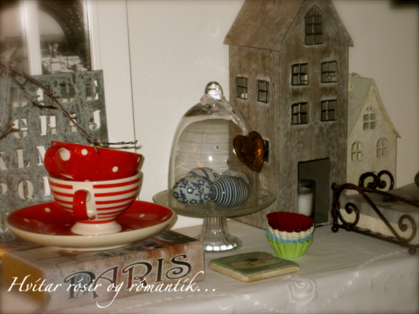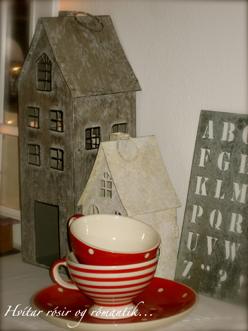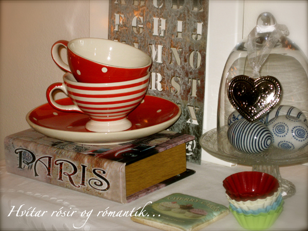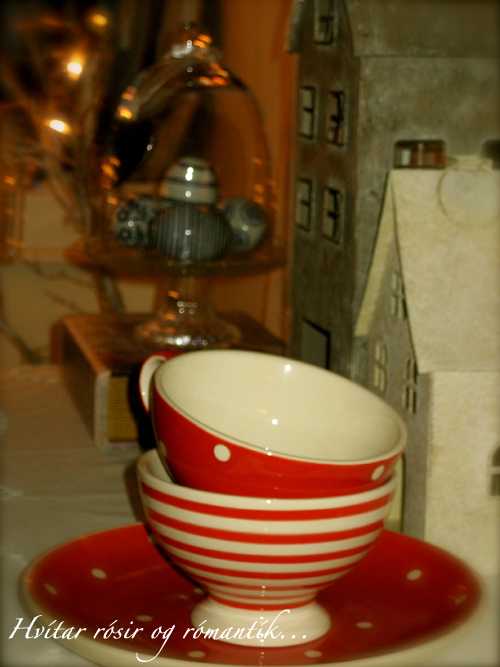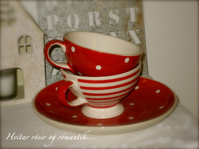 Einn af mínum mörgum veikleikum, er fyrir fallegum bollum 😉 Og um daginn sá ég svo svakalega sæta bolla sem bara urðu að koma með mér heim! haldið ekki að þeir séu RAUÐIR!!! hissa? 🙂 hehehe já minn uppáhaldslitur! Ég er búin að prófa að stylla þeim upp hér og þar, en finnst þeir hvergi njóta sín nóg og vel! Ég fann þó stað svona til bráðabirgða og ég bara verð að sýna ykkur þessa sætu krúttilegu bolla og diskinn sem ég lét fylgja með (ég stefni reyndar á, að bæta öðrum við)…