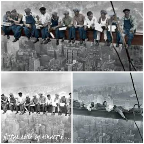Þessa „lituðu“ mynd langar mig að fá á púða og svo ætla ég að setja „hvíldarstundina“ á annað kerti… En það hefur ekki verið í lagi hjá þessum gæjum að hanga nánast í lausu lofti eins og ekkert væri. Ég myndi allavegana ekkert vera mjög svöng í þessarri hæð… 😉