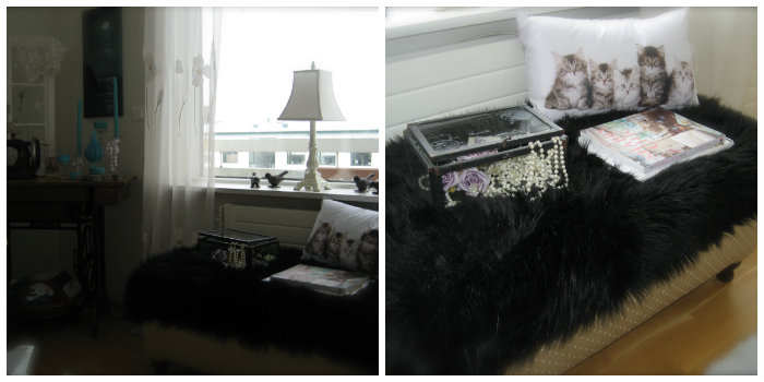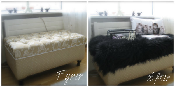 Þið munið kannski eftir kollinum sem ég klæddi um daginn með svörtu efni sem er eins og skinn 😉 Þar sem mikill afgangur var af því þá þurfti að finna stað fyrir það og hér eru myndir af „geymslustaðnum“
