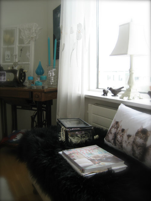 Bekkurinn í stofunni reyndist vera upplagður geymslustaður fyrir svarta skinnið 😉