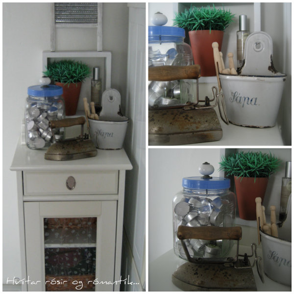 Þvottahússkápurinn er bara að koma sterkur inn, með öllu dúllerýinu! Gamall þreyttur straubolti, sápubaukur saddur minninga og svo annað sem er töluvert nýrra… 😉 en Krukkan góða er flott með nýju höldu-kórónuna sína!