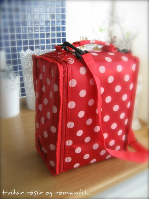 hún er að sjálfsögðu rauð og er með hvítum doppum, þetta er eiginlega svona ferðataska 😉