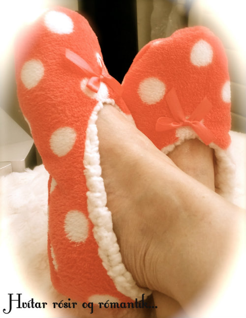 Skórnir eru svo ekta „eftir-bað-skór“ og ég elska litinn á þeim ooooooog þeir eru með doppum sem er sko ekki leiðinlegt 😉 hehehe En sjáið bara sætu mjúku kósýskóna mína!