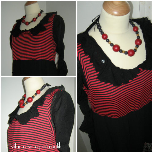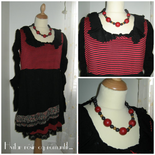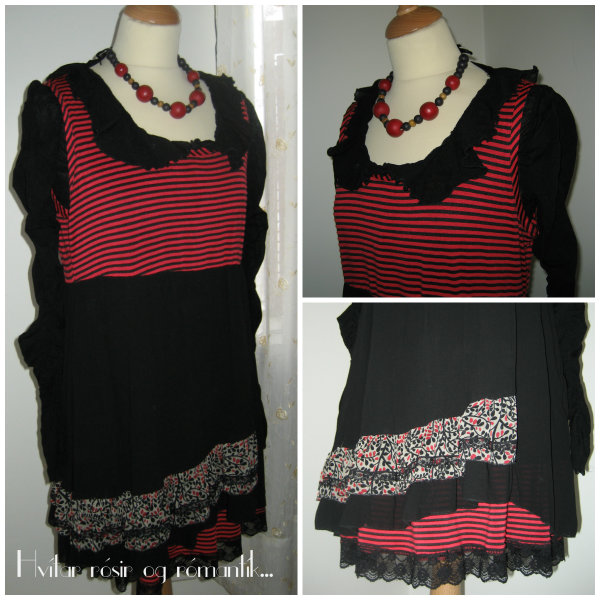 Það kemur sjálfsagt engum á óvart að kjóllinn er rauður og svartur 🙂 hann er með léttu og margskiptu pilsi…