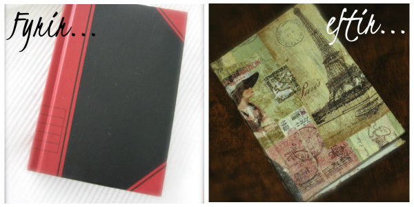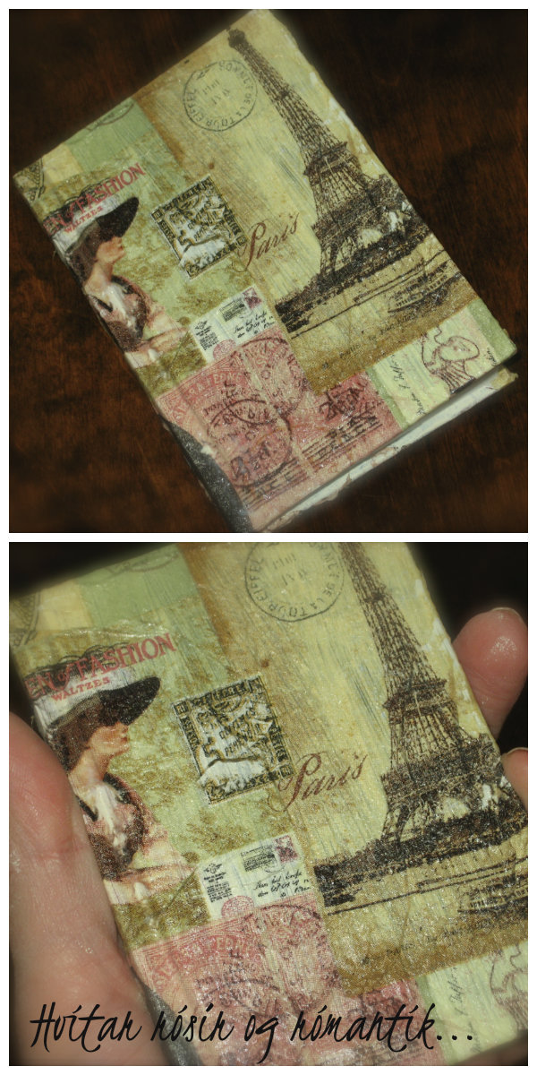 Frúin rakst á svo flottar servíettur í Föndru um daginn, að þær fengu að koma með heim. En þegar þangað var komið var farið að spá í hvað hægt væri að gera við þessar flottu servíettur og vitið bara hvað ég rakst á eina „gamla“ vasabók, sem var svosem ekkert fjaska fín og þurfti því smá makeup…