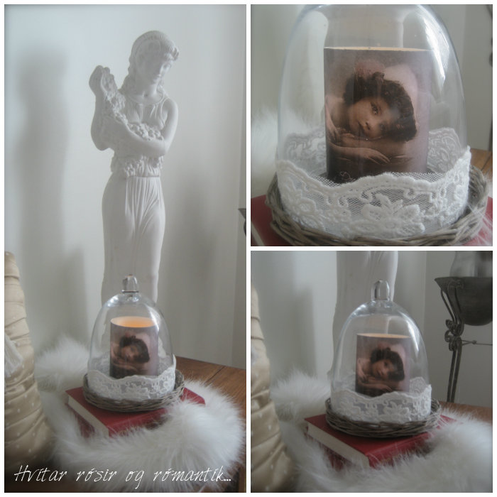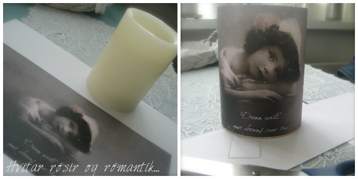 Því næst var sótt falleg mynd í safnið. Ok ég á alltaf til útprentaðarmyndir, þar sem maður getur alltaf lent í því að vanta bráðnauðsynlega eins og eina mynd… 😉 og hver vill sitja í þeirri súpu, að eiga ekki til mynd? -ekki ég… Myndin var sniðin til, tyllt á kertið að aftan með teipi og allt var reddý…