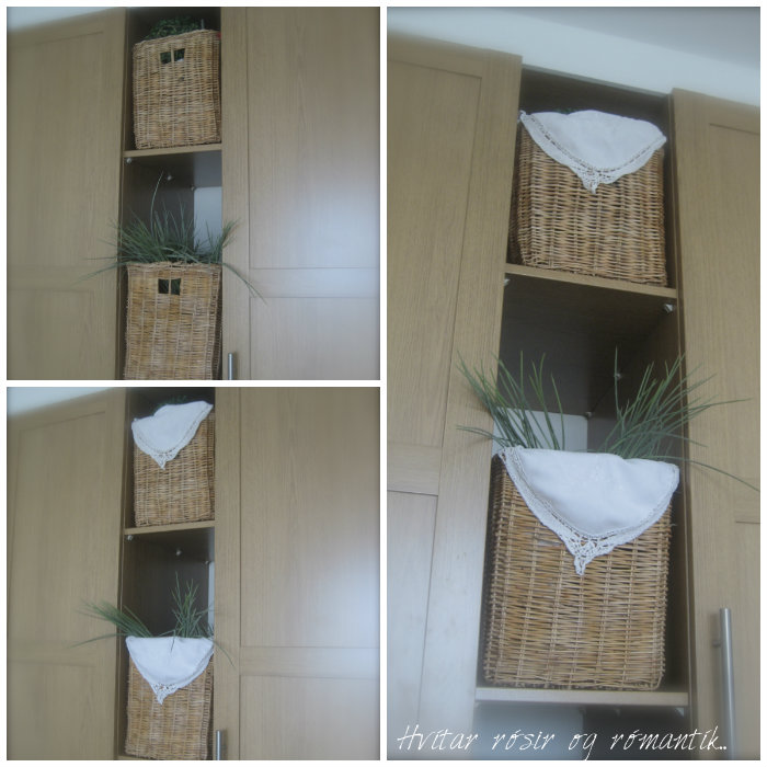 En þar sem ég var nú byrjuð að duddast þetta í svefnherberginu. Nú þá hélt frúin áfram… Skáparnir í svefnherberginu er stórir og góðir, enda verða þeir að vera það þar sem þeir hýsa ansi marga kjóla sko 😉 eeeen það er svo leiðinlegt bil á milli þeirra sem nýist í ekki neitt, ég hef notað stórar bastkörfur þar inní svona til að fylla smá uppí og það er bara allt í lagi. Körfurnar fengu smá andlitslyftingu í leiðinni, hér eru fyrir og eftir myndir af þeim…