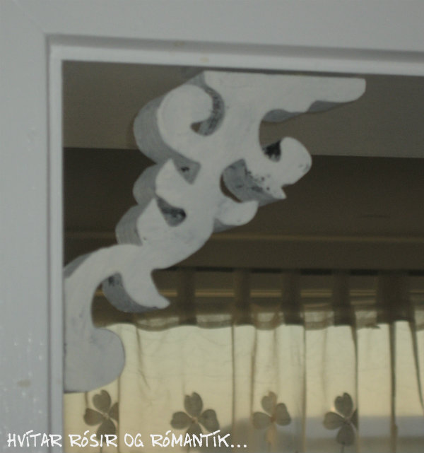 Hehehe ein vooooða óþolinmóð… ég bara varð að sjá hvernig þetta kæmi út, svo að ég festi skrauthornlistann upp með kennaratyggjói svo ég gæti líka tekið mynd 😉 Þessir „horn“ eru líka sniðug og flott skraut sem hilluberar.