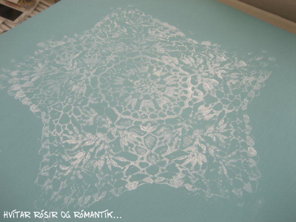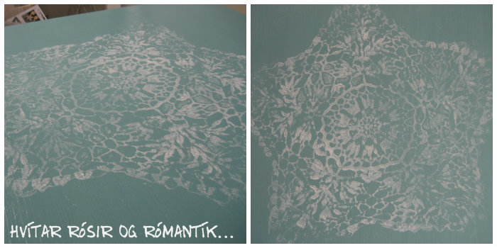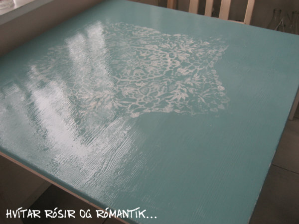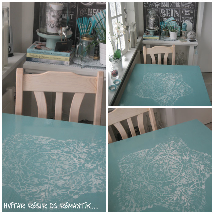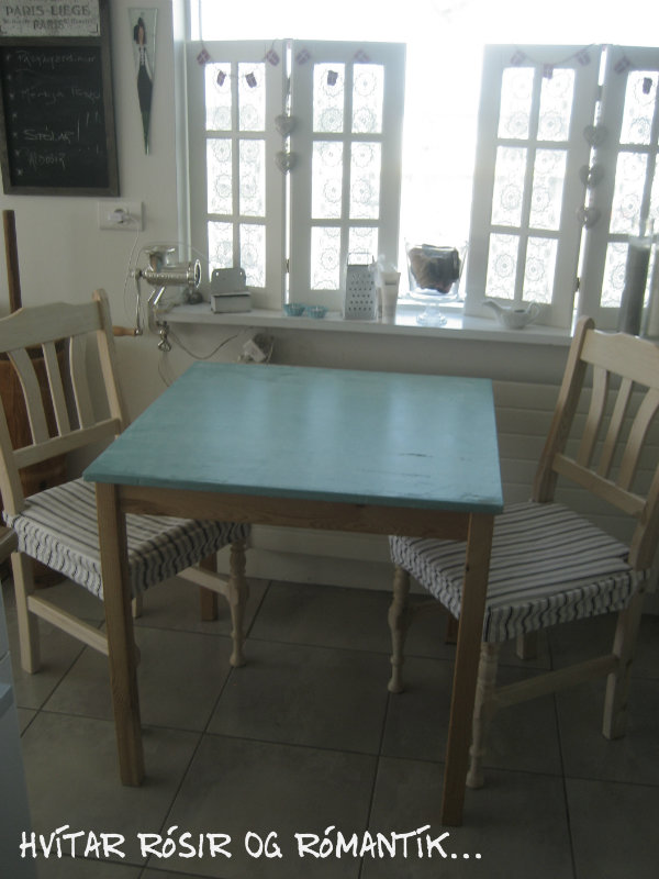 Konan byrjaði jú á því að mála borðplötuna bláa og fæturna hvíta… úbbs en hún gleymdi að taka „fyrir“ myndir, sumum liggur svo á!!!