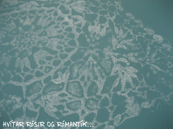 Gamall dúkur sem fannst í „þeim góða“ er dreginn framm og hann gegnbleyttur í hvítri málningu , passa þó að hafa ekki of mikið né of þunnt… þá verður þetta bara klessuverk!