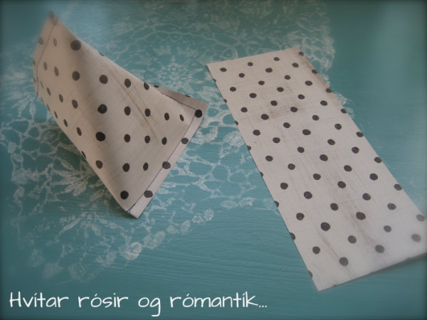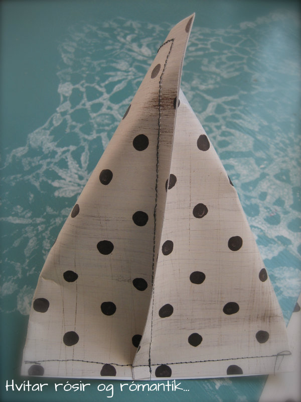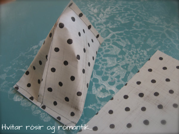Það skemmtilega er að maður getur notað hvaða pappír sem er t.d eru auglýsingabæklingar og blöð tilvalin. Ég átti til doppóttann pappír sem er dálítið stífur og ber sig því vel 🙂 Ég saumaði fyrst botninn og aðra hliðina, síðan setti ég gjöfina (pening) ínní og saumaði svo bara fyrir. Þetta er mjög fljótlegt og það er öðruvísi að gefa svona pakka.