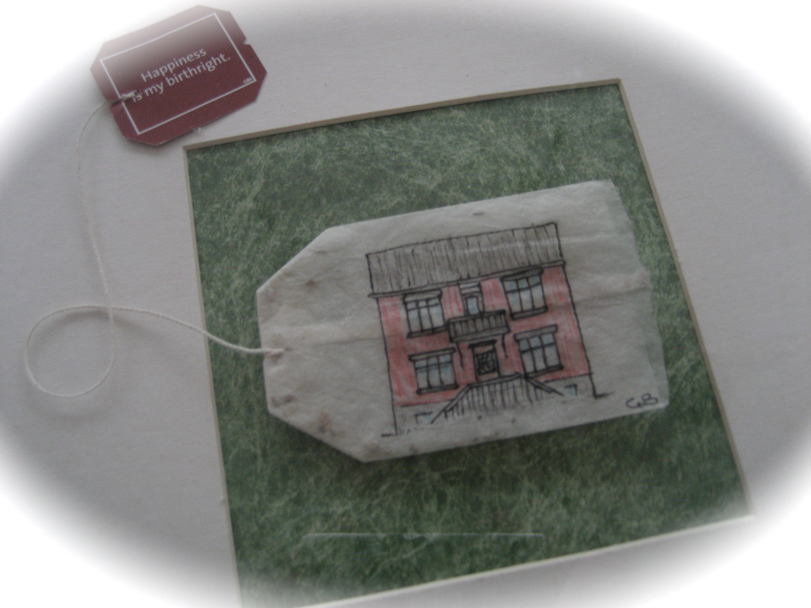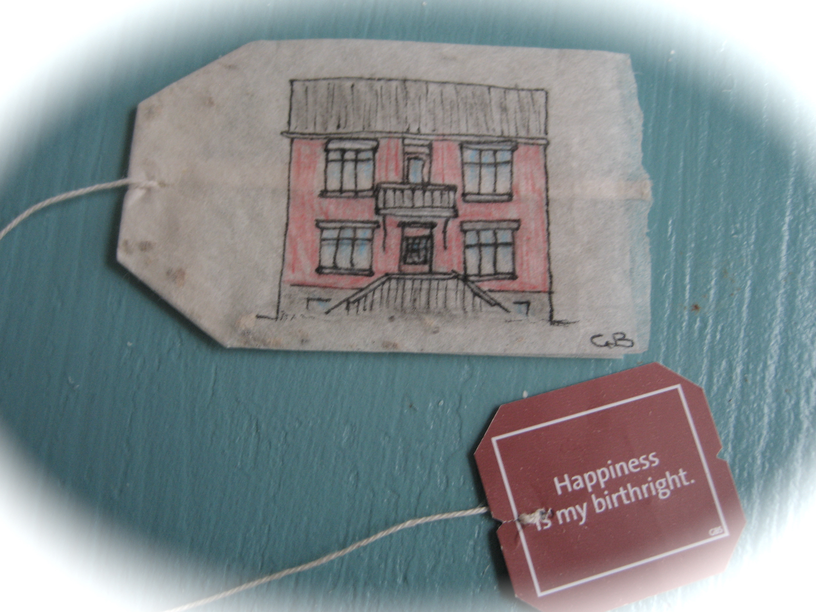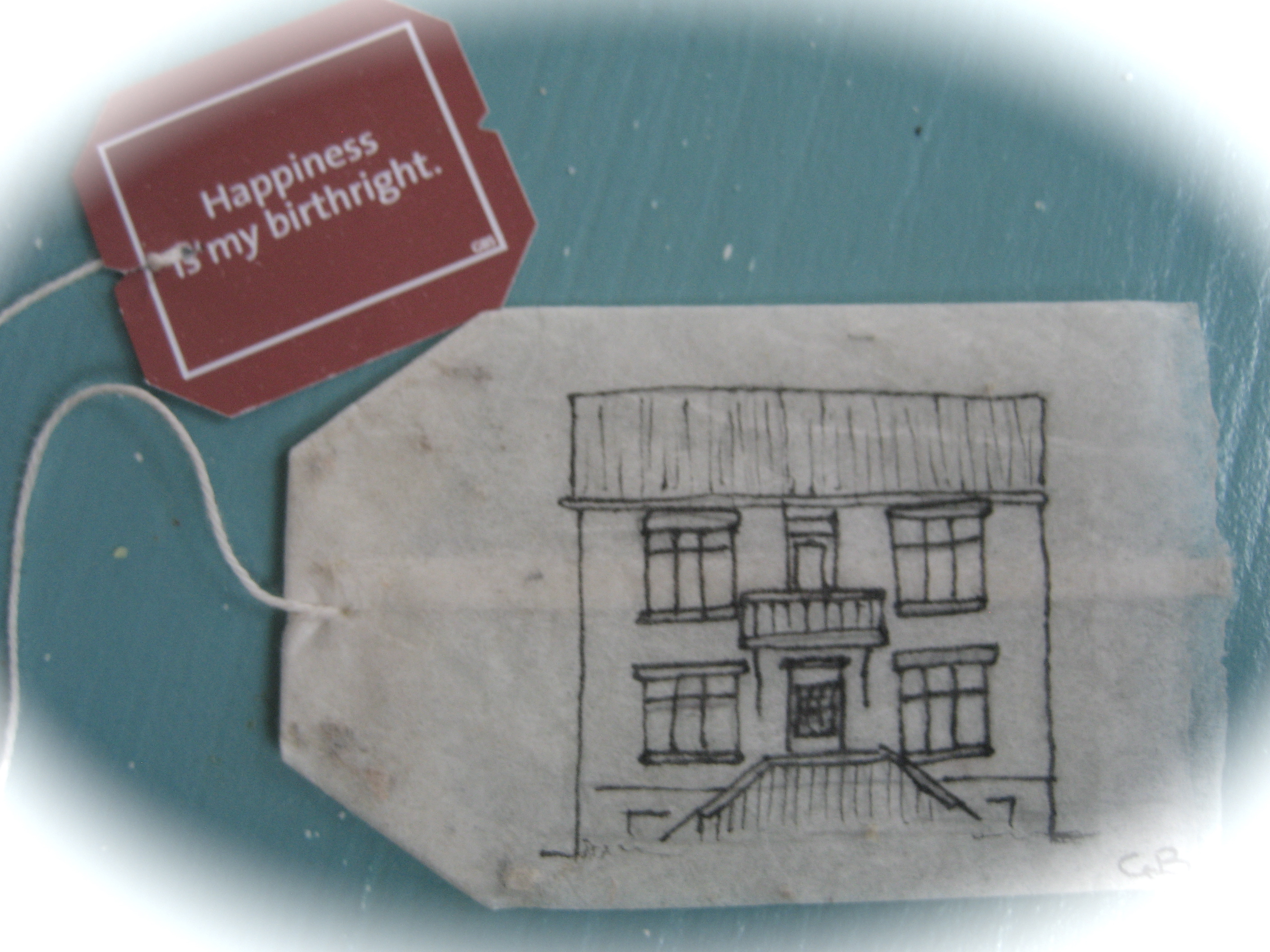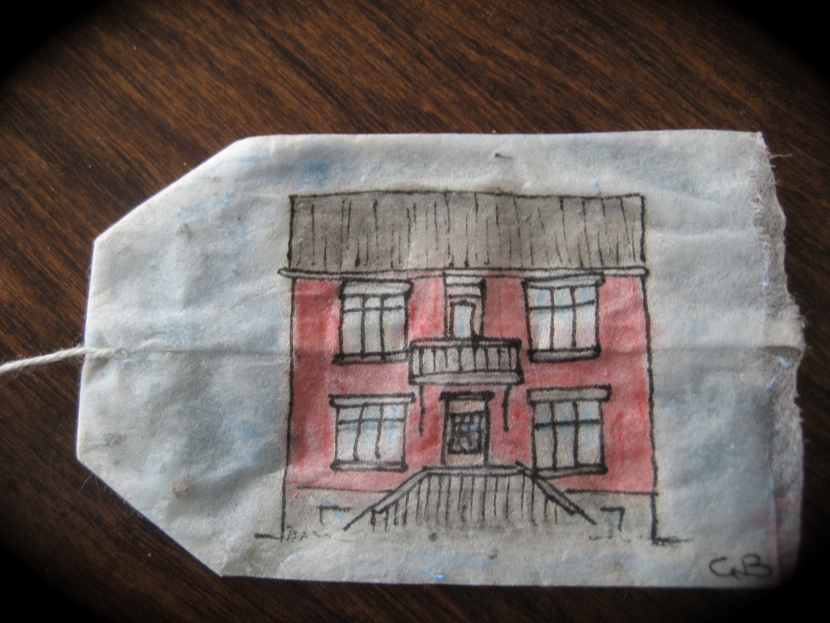 ..og einhvern veginn fékk ég þá flugu í hausinn að finnast ég verða að teikna nýja fallega húsið mitt á tepokann. Svo ég byrjaði á að rissa það upp…