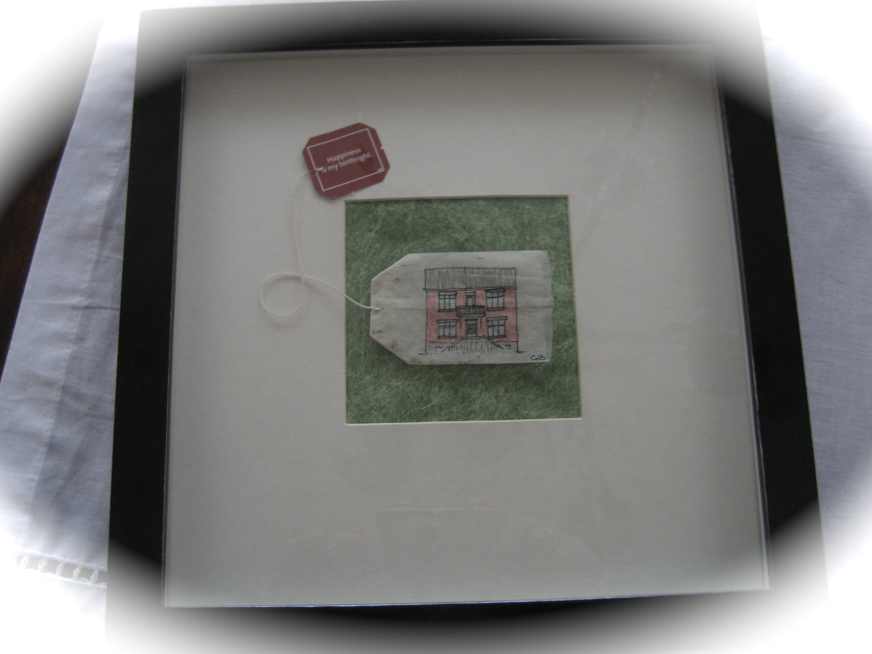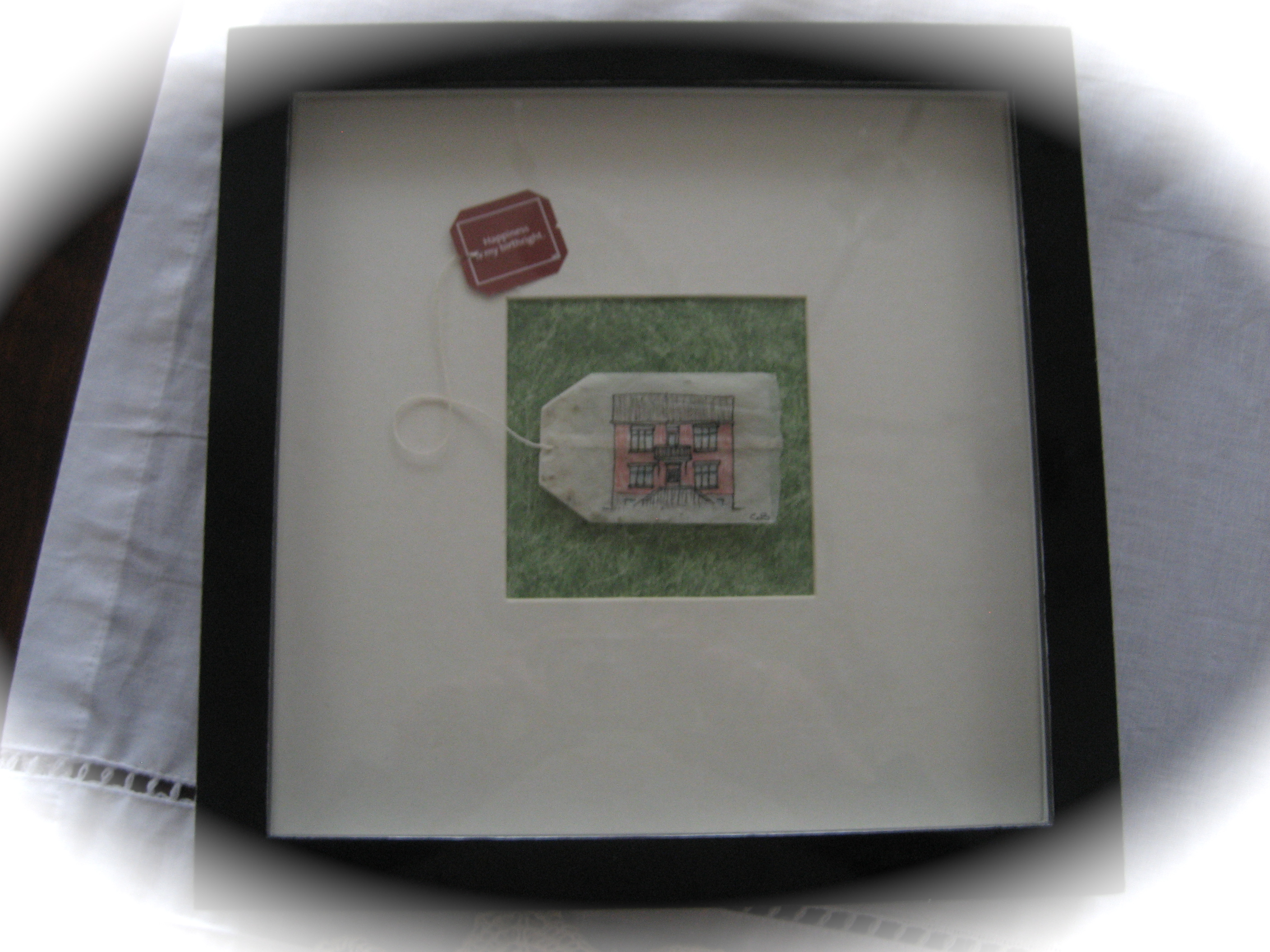 Frú bráðlát skellti herlegheitunum í ramma sem hún fann inni í föndurherbergi (merkilegt hvað hægt er að finna þar, í þessarri líka litlu skonsu…) en ég sé það að ég þarf annann og minni ramma utan um tepokann minn.