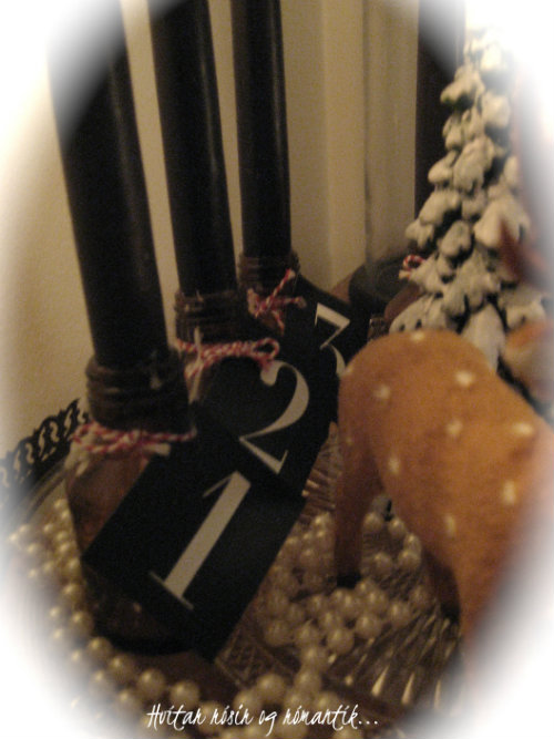 litlar flöskur halda kertunum uppi og svo eru merkispjöld sem telja niður fyrir Frúnna…
