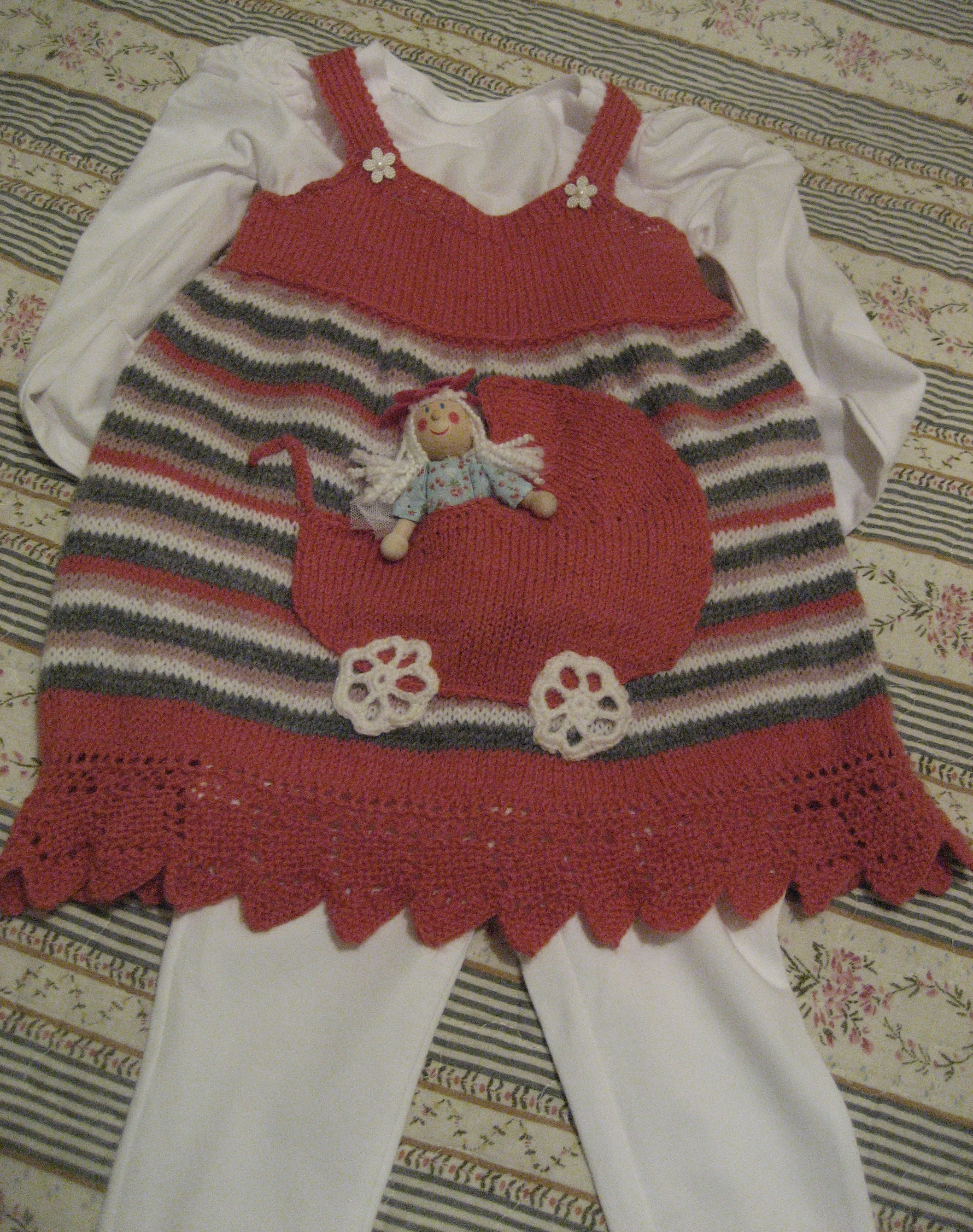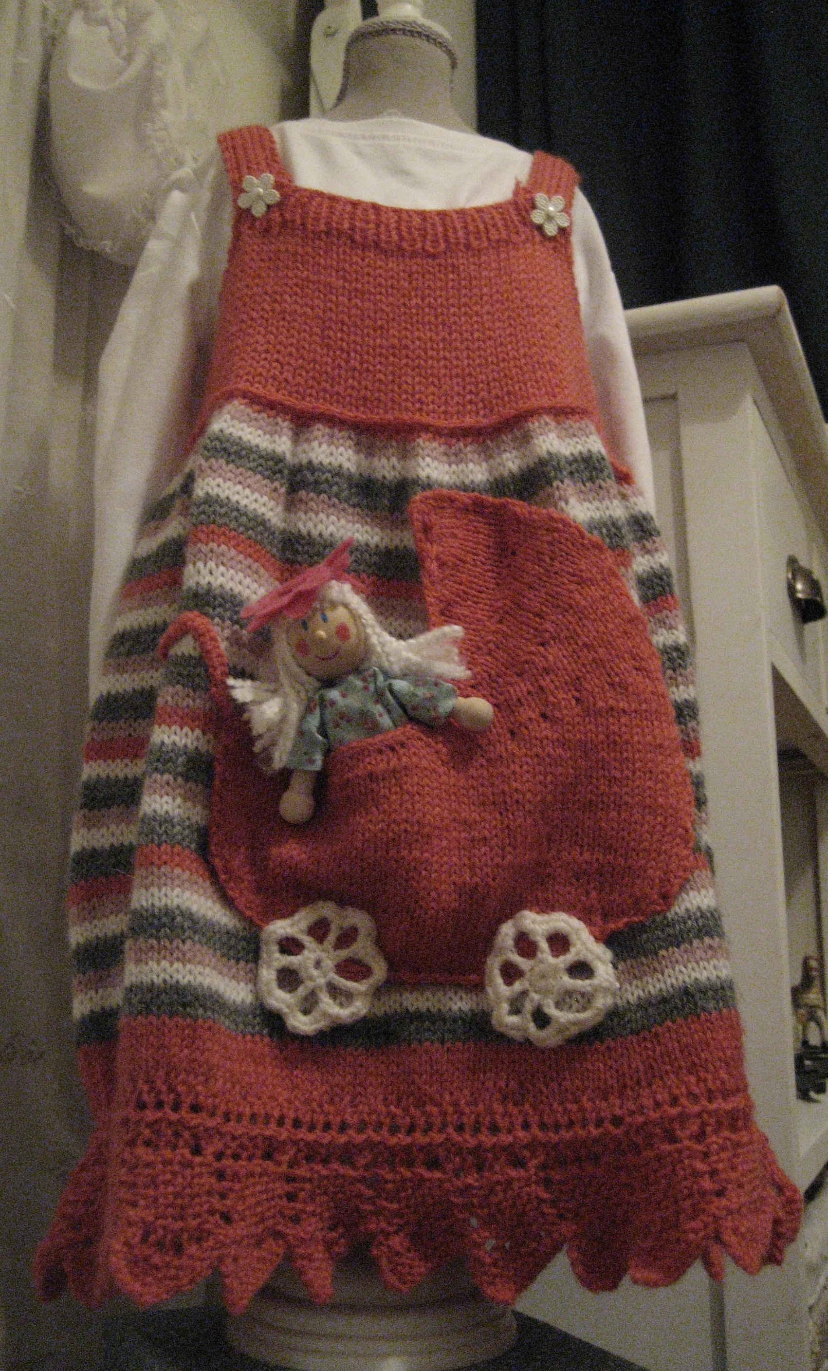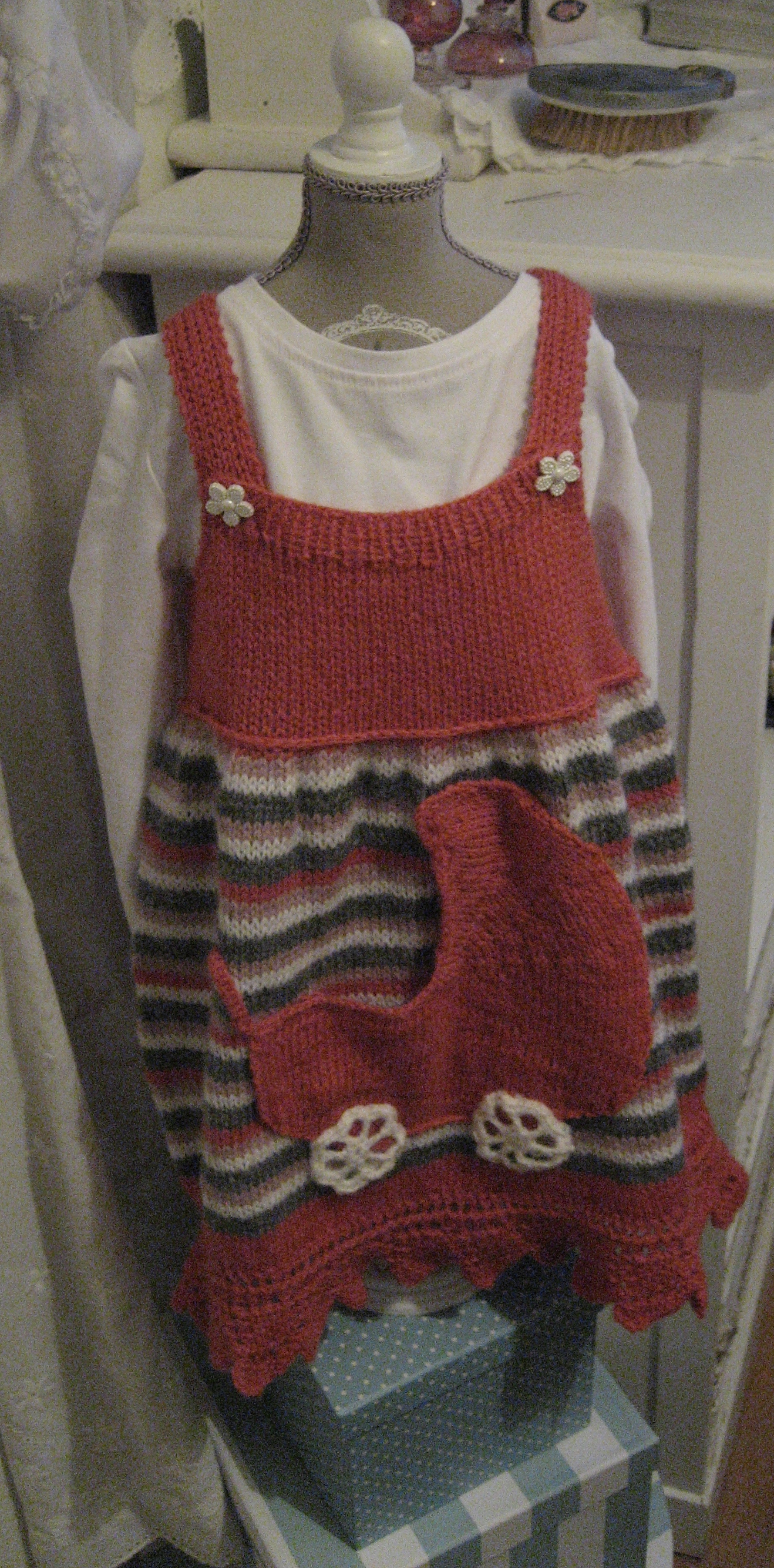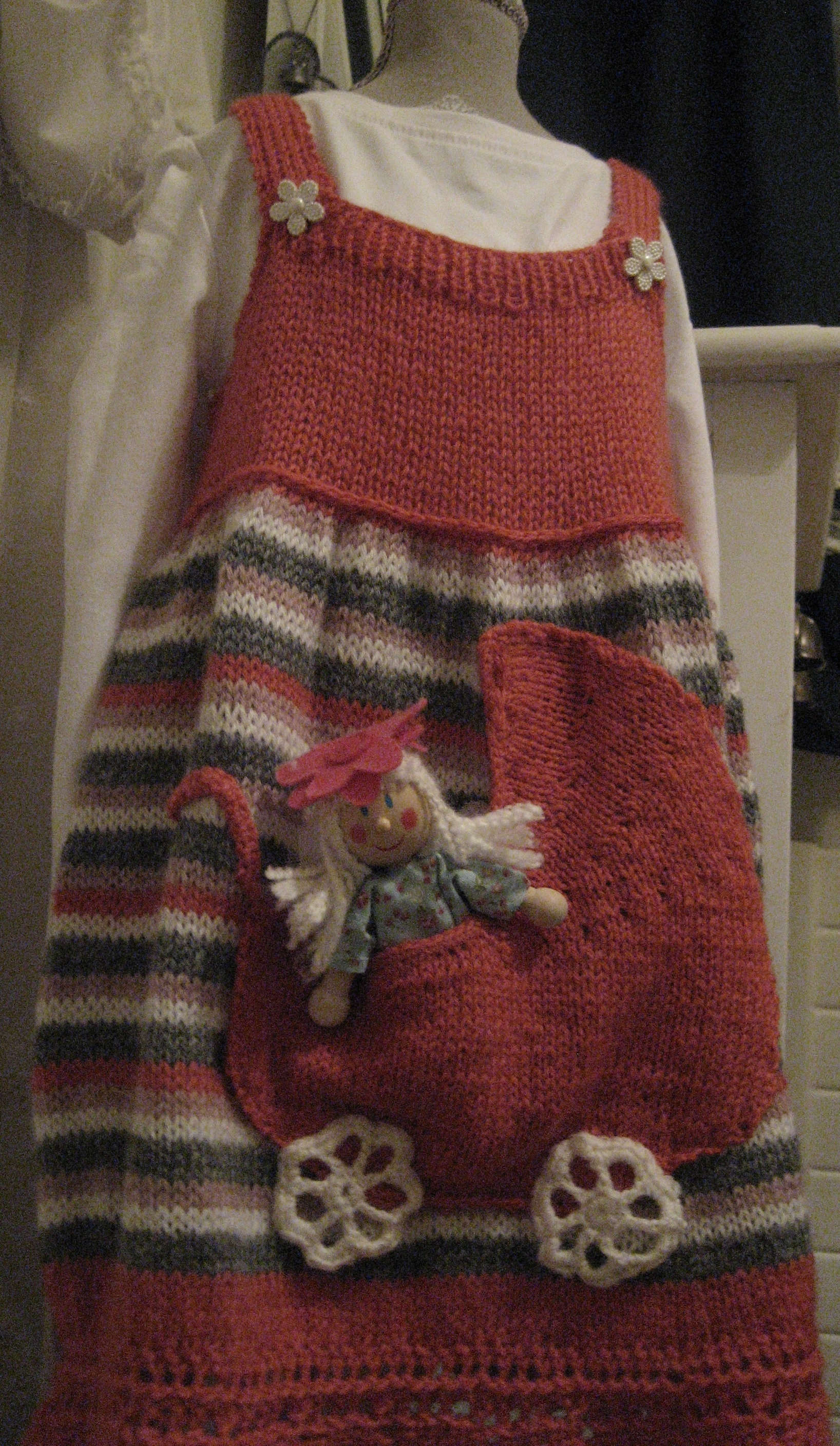 Ég prjónaði sem sagt þennan sæta kjól á yngstu ömmuskottuna mína og mér finnst vagninn framan á toppa þetta allt saman…