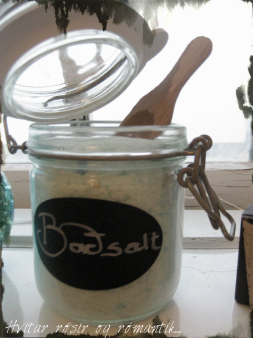 Fyrst var framleitt baðsalt í tveimur ilmtegundum, þar á eftir var skellt í baðilmolíu og síðast voru gerðar baðbombur sem þurfa víst nokkra daga til að „þorna“… myndir af þeim koma  síðar… -vonandi!