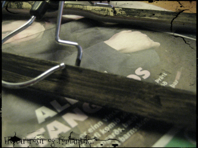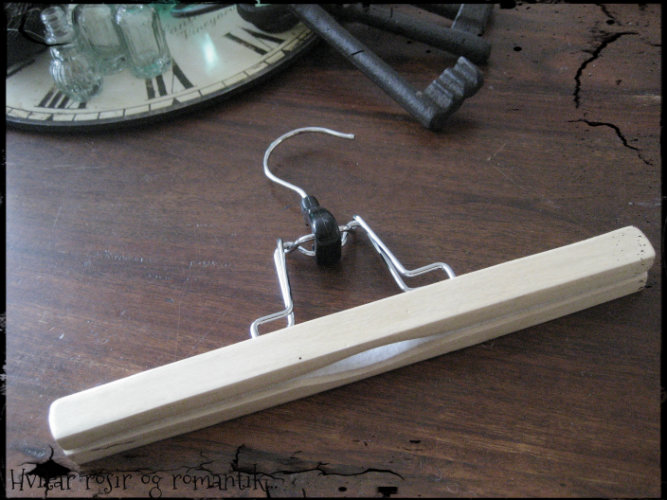 …þá mundi ég eftir því að hafa séð svo svakalega sniðuga hugmynd á flakki mínu um netið, þar sem „klemmu“herðatré var notað til að hengja upp myndir og dagatöl! Heppna ég að eiga slatta af slíkum herðatrjám…