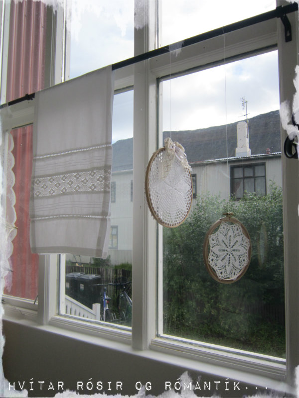 Frúin er búin að puða dúkum upp í alla glugga, tvo fremri setti ég í gamla saumahringi sem ekkert voru notaðir…