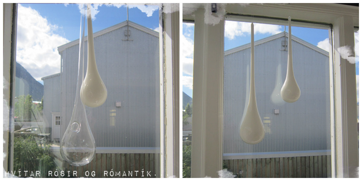Þessir glerdropar voru keyptir í Blómaval, með það í huga að hella inn í þá hvítri málningu. Mér finnst þeir koma æðislega vel út -Frúnni langar reyndar í einn í viðbót til að hella inn í hann öðru lit…