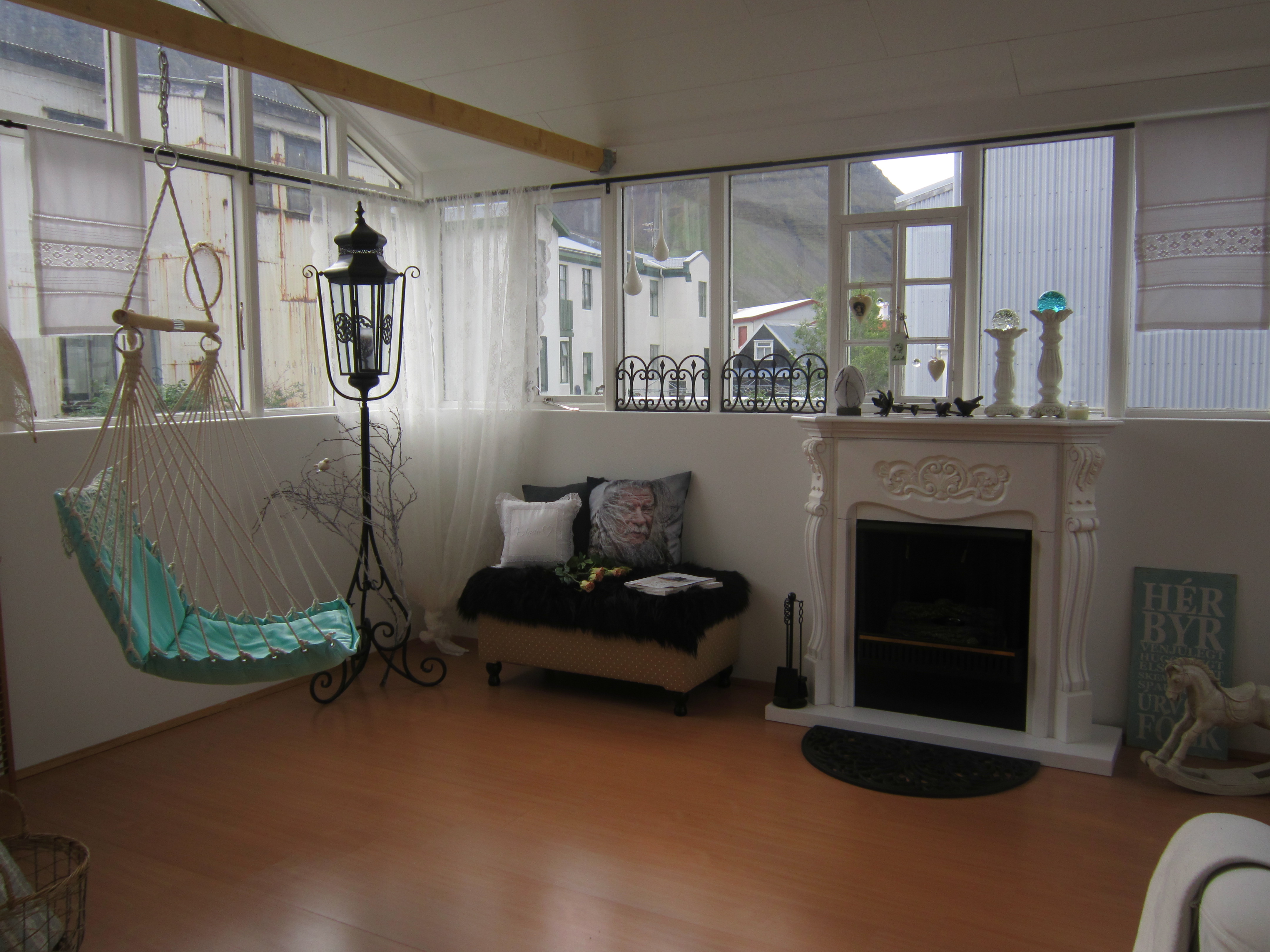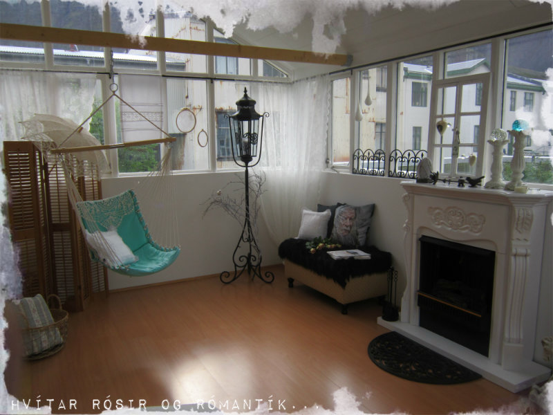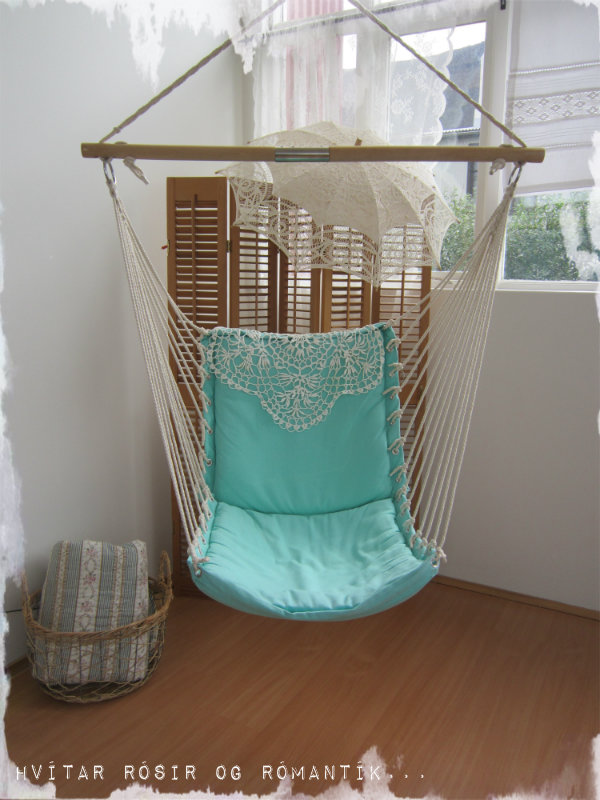 Ég fékk húsbóndann til að setja bita í loftið til að ég gæti hengt upp hengiróluna mína. Það er yndislegt að hanga þarna í rólunni, prjóna, eða bara hlusta á rigninguna og gera ekki neitt!!! Toppurinn er nú að kveikja upp í arninum og hafa það virkilega kósý…