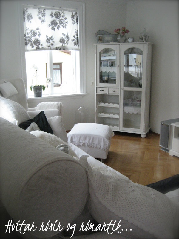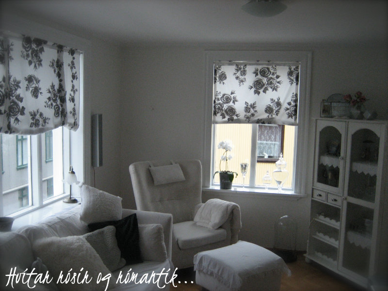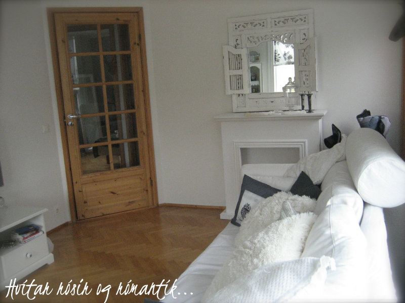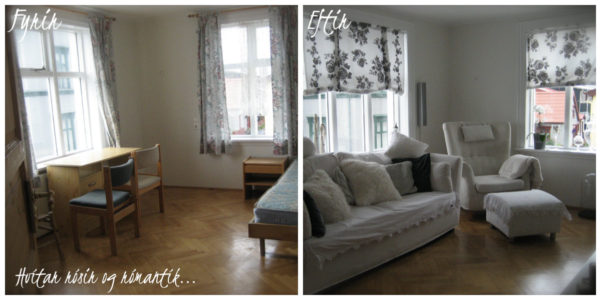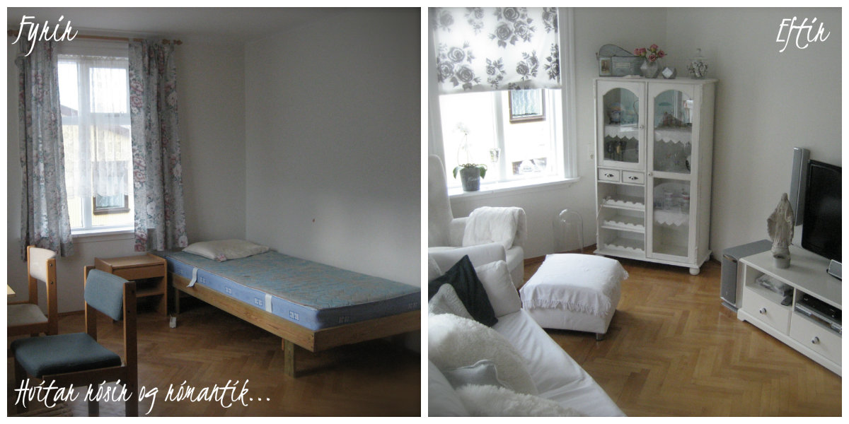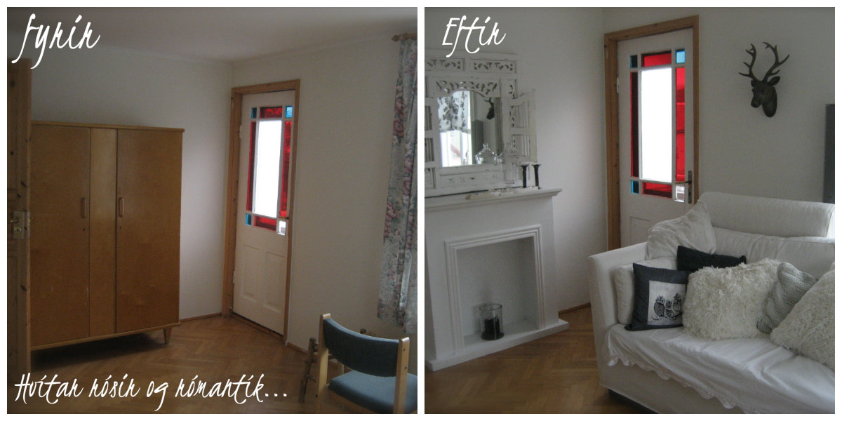 …og sem fyrr finnst mér voða gaman að leika mér að fyrir og eftir myndum þ.e frá því daginn sem við tókum við húsinu og svo eftir okkar „meðhöndlun“… Hvíti sófinn er voða þæginlegur kvöldkúrísófi, en hvíta Húsbóndastólinn í horninu fann ég í „þeim góða“ og þreif hann bara upp, en hann er alheill og óslitinn. Svo kostaði hann bara litlar 2500 kr. ❤ Gardínurnar eru enn á hönnunarstigi en ég á eftir að sauma á þær upphengjur…