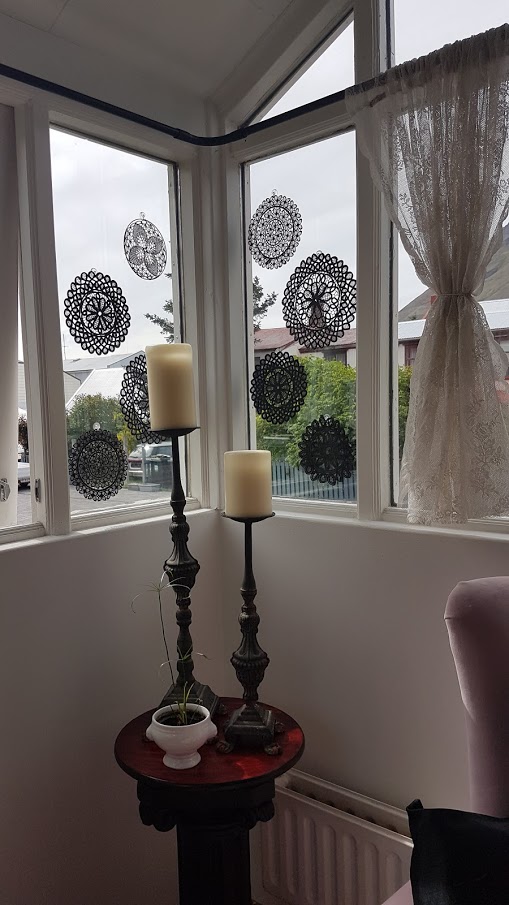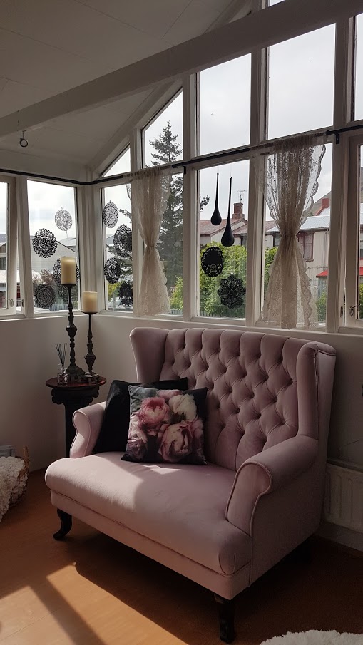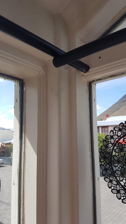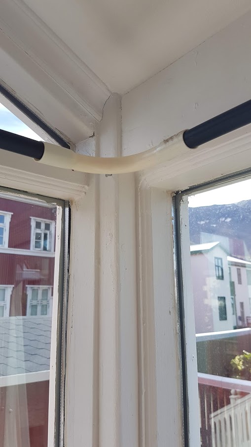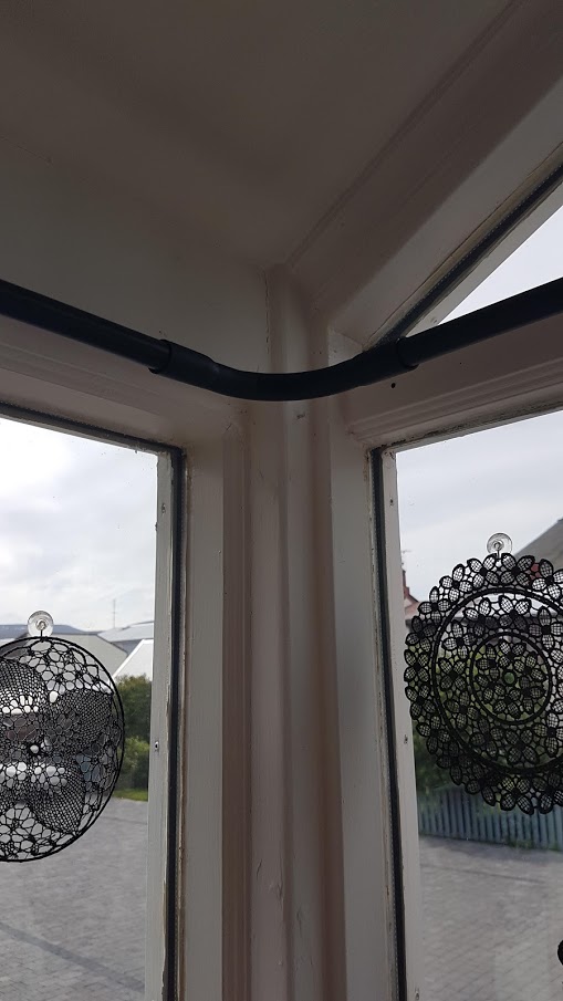 Ég er með gardínustöng inni í sólstofunni hjá okkur og hún hefur verið með hálfgerð vandræði í hornunum. Ég fann svo um daginn inni í skúr hjá húsbóndanum plaströr sem pössuðu svo flott á stangirnar, að ég var fljót að gera þær að tengingu á stangirnar 😉