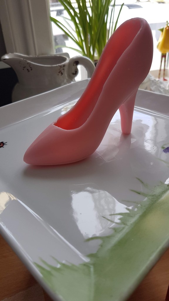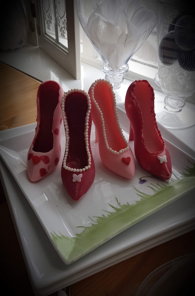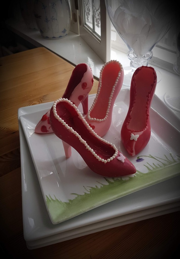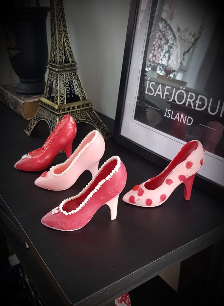 Þessa gerði ég úr rjómasúkkulaði fyrir 2 árum síðan…Í dag notaði ég rautt og bleikt súkkulaði…Svona skómót er algjör snilld…Hér er ég búin að setja gult súkkulaði í mótið…Bleikur skór nýkomin úr skómótinu og bíður eftir smá sjæni…