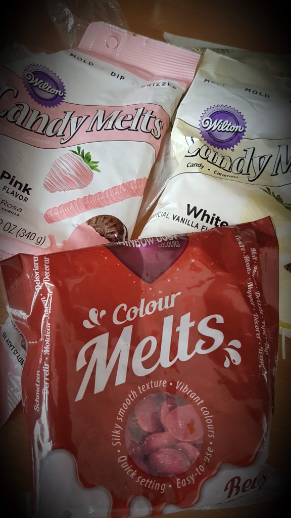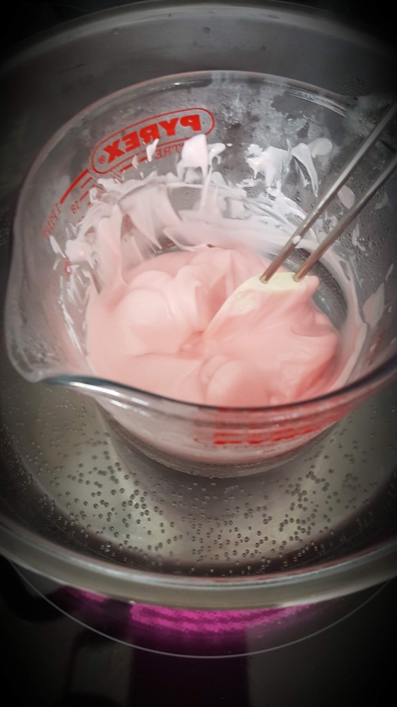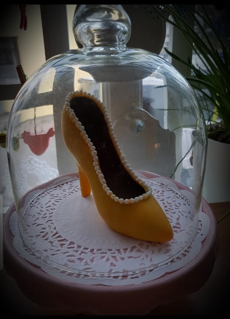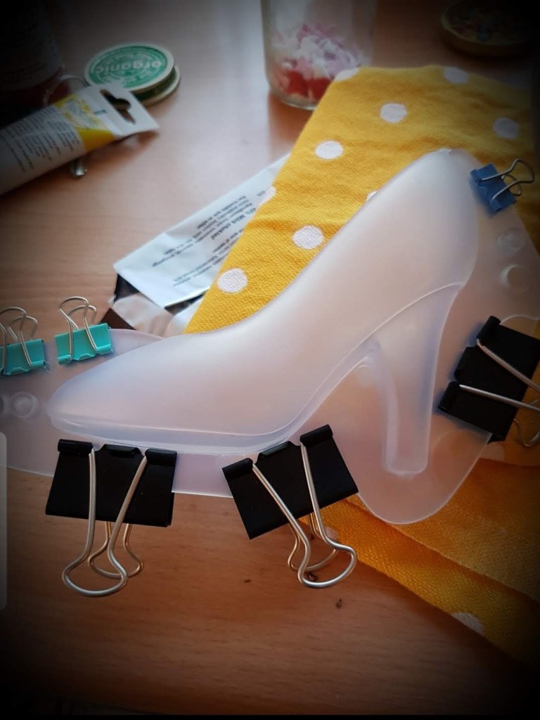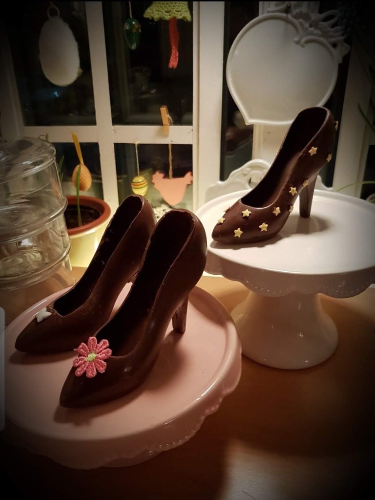 Þessa gerði ég úr rjómasúkkulaði fyrir 2 árum síðan…Í dag notaði ég rautt og bleikt súkkulaði…Svona skómót er algjör snilld…Hér er ég búin að setja gult súkkulaði í mótið…Bleikur skór nýkomin úr skómótinu og bíður eftir smá sjæni…