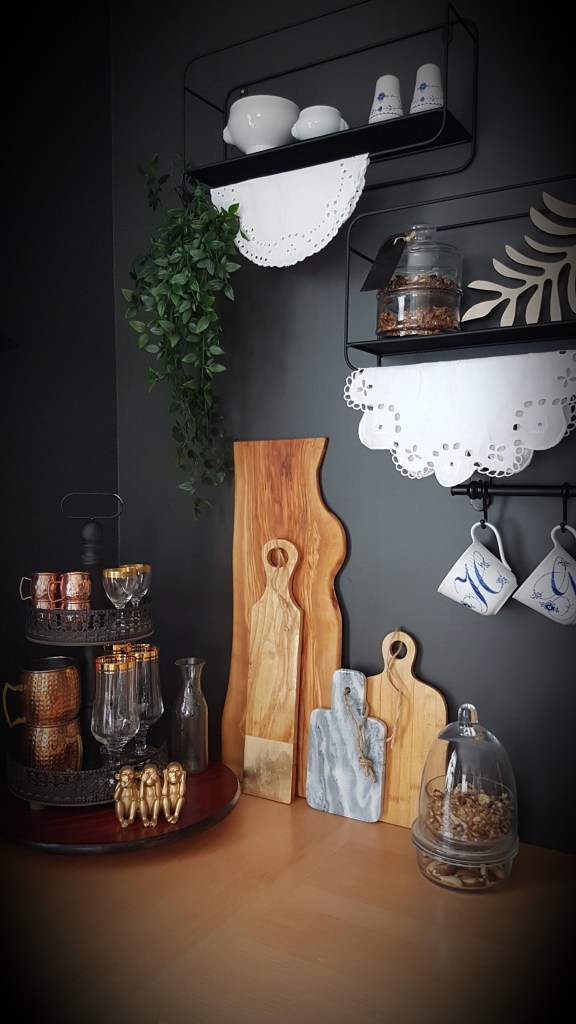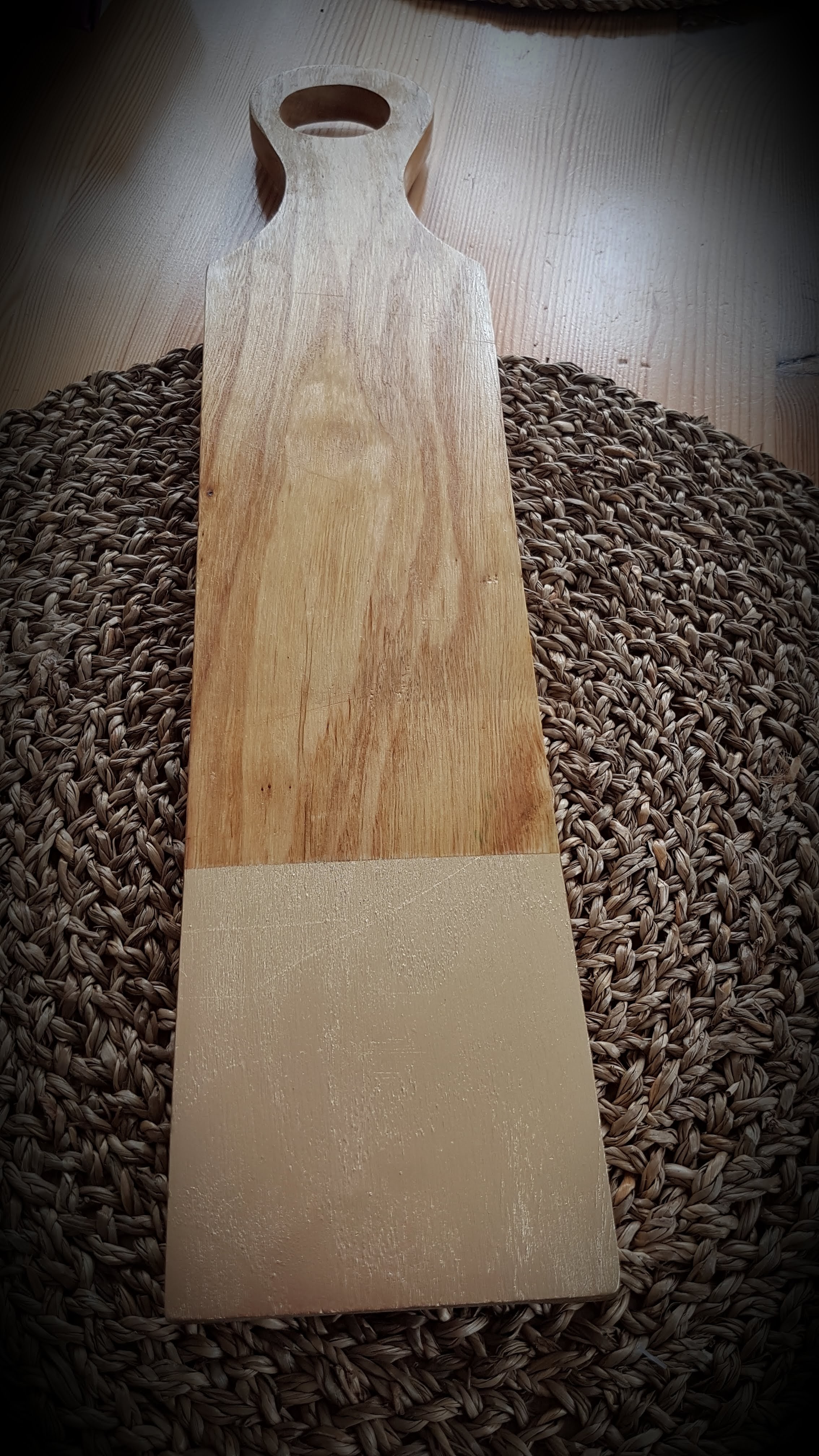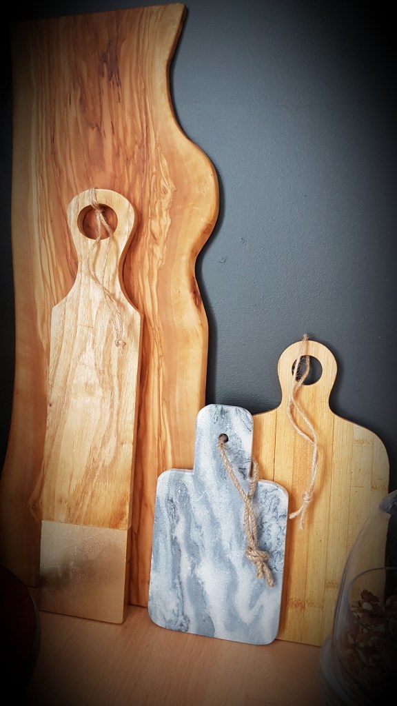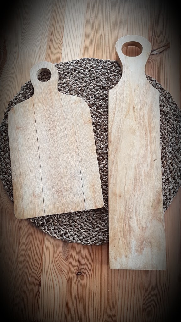 …ég kìkti á nytjamarkað í dag og rakst á tvö trébretti sem mér leist vel á og keypi fyrir 200 kr. Vinur minn myndi segja að það væri ekkert verð fyrir þann pening… þegar heim kom bar ég olíu á þau til að hressa viðinn aðeins og ég spreyjaði hluta af öðru gull litað…
